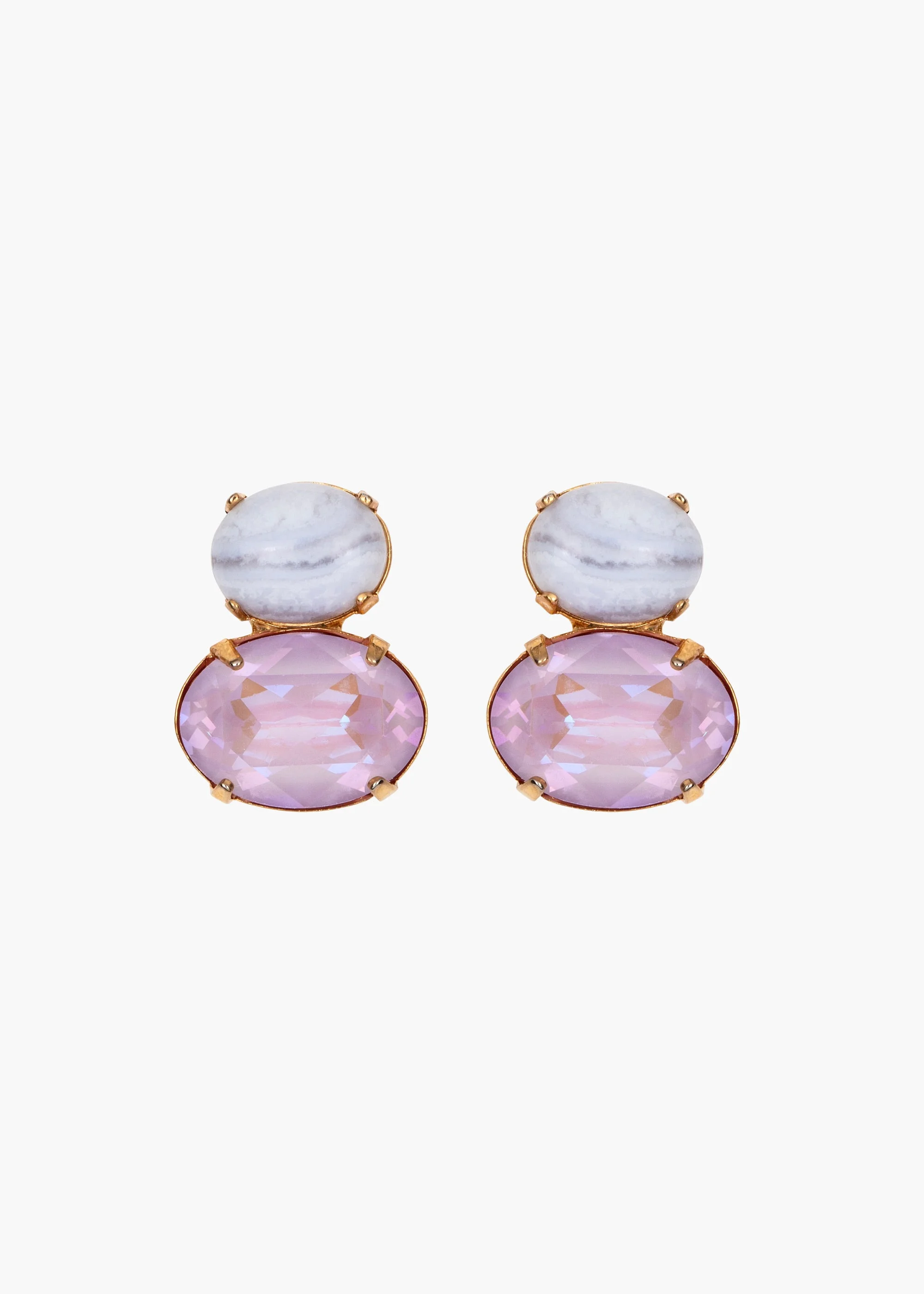 The Yvette Earrings combine gorgeously faceted crystals with semi-precious gemstones to create a harmonious tonal palette. They feature either semi-precious blue lace agate, a highly prized stone naturally formed in seabeds, known for its association with the throat chakra, promoting calm, clear communication or semi-precious chalcedony, which is known as a grounding stone for its ability to promote calmness and inner peace. . These delicate earrings pair seamlessly with anything. Dimensions: 0.75 inch length Material The Yvette Earrings are made by hand in New York from semi-precious stone elements and Czech crystals. All stones have natural variances in color and markings that make each one unique. They have a surgical-steel post, are nickel-free and safe for sensitive skin. We recommend storing earrings in their dust bag while not in use, and avoiding contact with water, perfume, hairspray, and other chemicals.