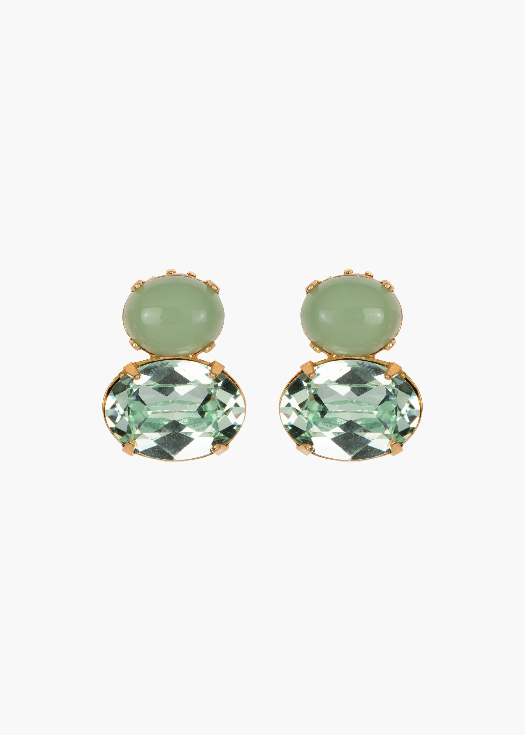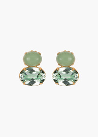The Yvette Earrings combine gorgeously faceted crystals with semi-precious gemstones to create a harmonious tonal palette. They feature either semi-precious blue lace agate, a highly prized stone naturally formed in seabeds, known for its association with the throat chakra, promoting calm, clear communication or semi-precious chalcedony, which is known as a grounding stone for its ability to promote calmness and inner peace. . These delicate earrings pair seamlessly with anything. Dimensions: 0.75 inch length Material The Yvette Earrings are made by hand in New York from semi-precious stone elements and Czech crystals. All stones have natural variances in color and markings that make each one unique. They have a surgical-steel post, are nickel-free and safe for sensitive skin. We recommend storing earrings in their dust bag while not in use, and avoiding contact with water, perfume, hairspray, and other chemicals.