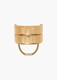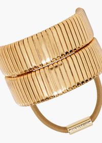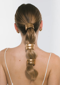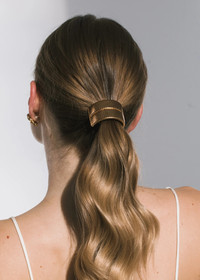 The Zarine Ponywrap draws inspiration from iconic fine jewelry, for an elevated look, featuring 18-karat gold-plated hand-formed chains. We love layering multiples at once— the Zarine has been used by a prominent celebrity hairstylist to achieve a dramatic stacked look. It's finished with Japanese elastic, for optimal strength and stretch. Dimensions: 1 1/4in x 3 1/2in Material The Zarine Ponywrap is made by hand in New York from 18K gold plated brass with an elastic closure. We recommend treating this piece as you would a piece of jewelry, and storing in the dust bag when not in use. Avoid contact with water, perfume, and other chemicals, including hairspray, which should be used before placement in the hair.