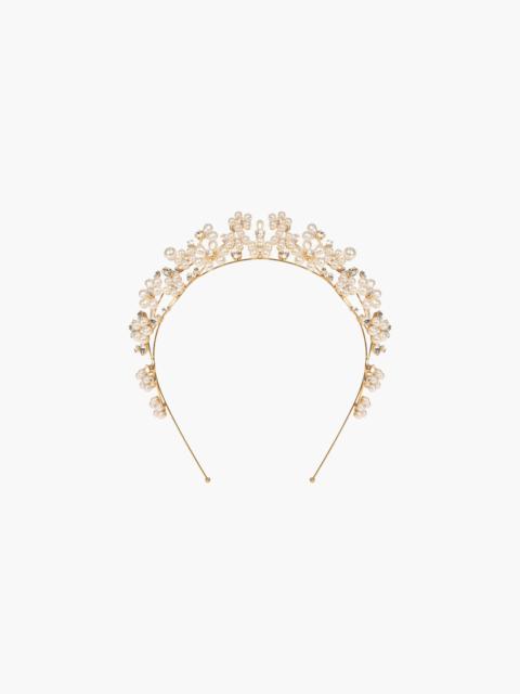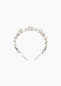 The Zaya Tiara is a queenly yet playful way to compliment a gorgeous white gown. Alternating Czech crystals and pearls form these flowers, the contrasting materials allowing the shapes to pop for a graphic look. Complete the look with the Zaya Stud Earrings, or add additional drama with the Zaya Bobby Pin Set. Dimensions: 1" in height, 12.75" in length. Material The Zaya Tiara is made in New York of crystal and crystal pearl embellishment, on a thin and flexible headband, which is custom designed to disappear in the hair and ensure hours of comfort. We recommend treating this headband as you would a piece of jewelry, and storing in the dust bag when not in use. Avoid contact with water, perfume, and other chemicals, including hairspray, which should be used before placement in the hair.