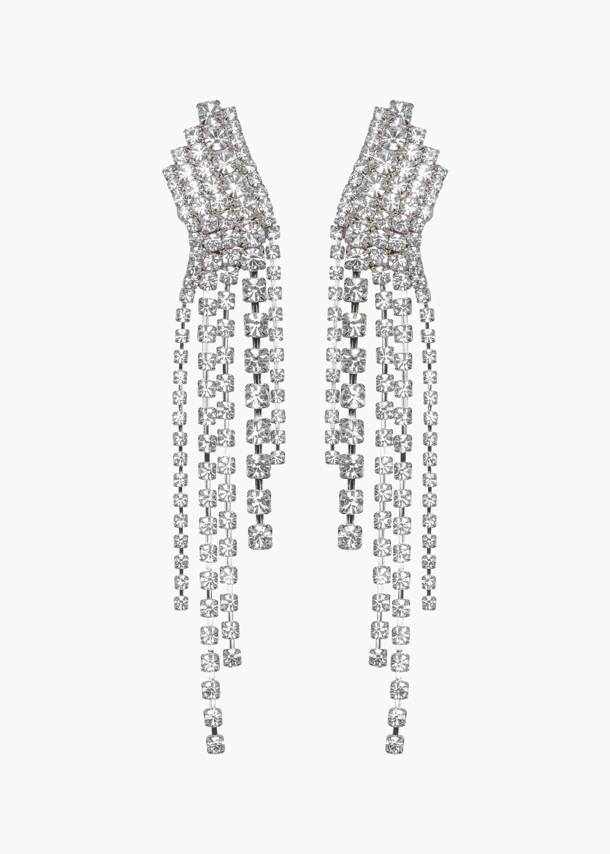 A Gatsby-inspired statement, the Zayla Earrings guarantee good times. Made by hand in New York, the crystal chains travel up the ear in a geometric shape, each chain eventually breaking free to give way to strands of free-flowing crystal fringe. The movement magnifies the sparkle, casting beams of light with your every turn. Dimensions: 4" length Material The Zayla Earrings are made by hand in New York from Austrian crystals and rhodium plated brass. They have a surgical-steel post, are nickel-free and safe for sensitive skin. We recommend storing earrings in their dust bag while not in use, and avoiding contact with water, perfume, hairspray, and other chemicals.