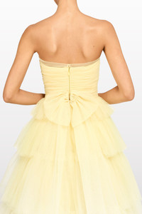 Meet Adore, a gown that exudes romantic drama with its voluminous, layered silhouette. The strapless bodice is softly ruched to enhance and flatter the figure, while tiered tulle cascades into a full, sweeping skirt that moves with airy elegance. The fabric is infused with subtle glitter, adding a light-catching shimmer to every step. A statement piece designed for occasions that call for bold beauty and timeless fairytale charm.