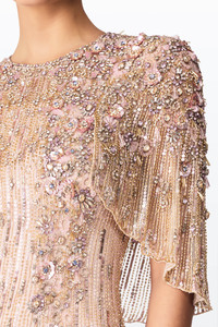 Astra is an opulent gown that shimmers with every movement, crafted for timeless glamour. Intricate beading and crystal embellishments cascade across the body, while the sculpted cape sleeves add regal dimension. The fluid column silhouette balances grace with drama. Perfect for black-tie galas or once-in-a-lifetime celebrations.