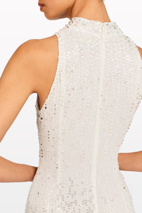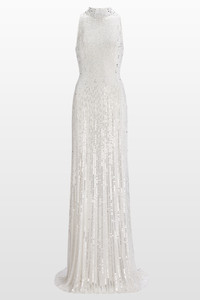This captivating gown exudes timeless elegance with its sleeveless design and high neckline, offering a sophisticated and graceful silhouette. Crafted in soft, delicate tones, the gown flows effortlessly, with a beautifully draped skirt that moves with a soft, ethereal grace. The gown is adorned with subtle embellishments that add a touch of sparkle and refinement, creating a soft, shimmering effect that enhances the gown's luxurious feel. Perfect for formal events or evenings soirees, this gown combines simplicity and glamour.
