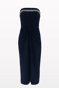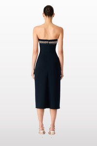 Blaze is a study in minimalist elegance, designed for the woman who commands attention through refined detail. This strapless gown features a tailored bodice that contours the figure with precision, enhancing the natural lines of the body while offering a sleek and sophisticated profile. The floor-length skirt flows effortlessly, creating a graceful silhouette with just the right amount of drama. Along the neckline, delicate crystal embellishments trace the edge, adding a soft, shimmering accent that catches the light with every movement. Ideal for evening galas, upscale cocktail events, or formal black-tie affairs, Blaze delivers an elegant and contemporary take on classic eveningwear. With its clean lines and quiet sparkle, this dress is the perfect choice for those who prefer their glamour understated, yet unforgettable.