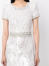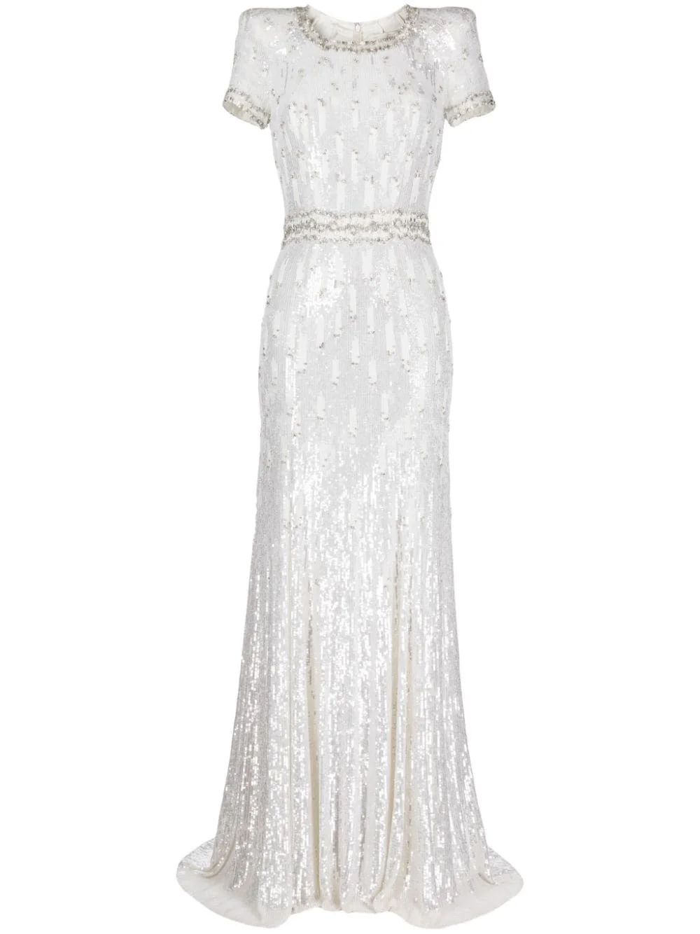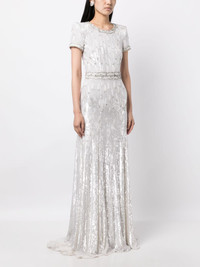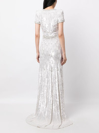 Kira sequin-embellished dress Famed for sophisticated and eye-catching evening dresses, designer Jenny Packham presents the Kira dress. The garment is covered in white sequins and further highlighted with shimmering crystals alonf the neckline, cuff sleeves and waistline. Highlights - Ivory white - Sequin embellishment - Crystal embellishment - Round neck - Fitted waistline - Concealed rear zip fastening - Short sleeves - Floor-length Imported Composition Viscose 100% SIZE & FIT Model measurements Height 5 ft 10 in(1.77 m) Bust/Chest 28.74 in(73 cm) Hips 35.82 in(91 cm) Waist 24.4 in(62 cm) FittingInformation Designed for a close fit throughout The internal shoulder pads offer a structured shape Made from a heavyweight non-stretch fabric This piece fits true to size – take your usual size Washing instructions Dry Clean Only
