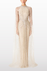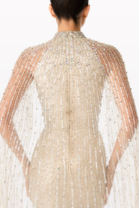 Vibrant, bold, and unforgettable, the Cairo mini dress is crafted for celebrations and evenings where every detail matters. Featuring a fitted bodice with a plunging neckline and a daring crossover back, this dress flatters the figure while adding a contemporary twist. The densely packed sequins create a textured, light-catching effect that dazzles from every angle, while the softly gathered waist ensures a balanced, flattering silhouette. The piece de resistance is the sheer, floor-length cape adorned with matching sequins, creating a stunning layered effect and a dramatic entrance. Pair with strappy stilettos, statement earrings, and a bold lip to amplify its party-ready glamour. Ideal for cocktail parties, high-profile social events, evening receptions, or special occasions where making a grand impression is essential, the Cairo dress is designed for women who embrace bold elegance and a playful, confident aesthetic.