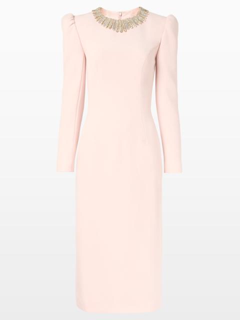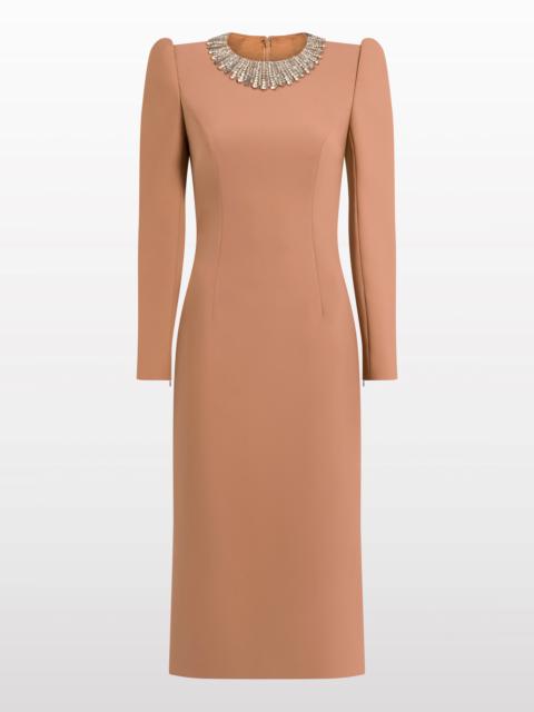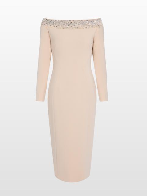 Calypso exudes refined sensuality, an off-shoulder gown designed to embody timeless allure with a modern, breathless pulse. The gracefully draped neckline reveals the collarbones with romantic intention, its edge adorned with delicate embellishments that glimmer like scattered stardust against moonlit skin. The fitted silhouette traces the body with liquid precision, flowing into a sleek mid-length skirt that moves with understated poise, creating elegance in every quiet step. Perfect for black-tie weddings, champagne receptions or rooftop soirees at twilight, Calypso thrives in settings where refinement is felt rather than announced. Style with pearl or crystal earrings, strappy sandals and softly waved hair draped over one shoulder to echo its fluid shape. A slim metallic clutch or satin minaudiere enhances the sculptural line, while a soft blush lip completes the tone. Calypso is not a gown of theatrics — it is a study in poise, polished, magnetic and unforgettable in its restraint.