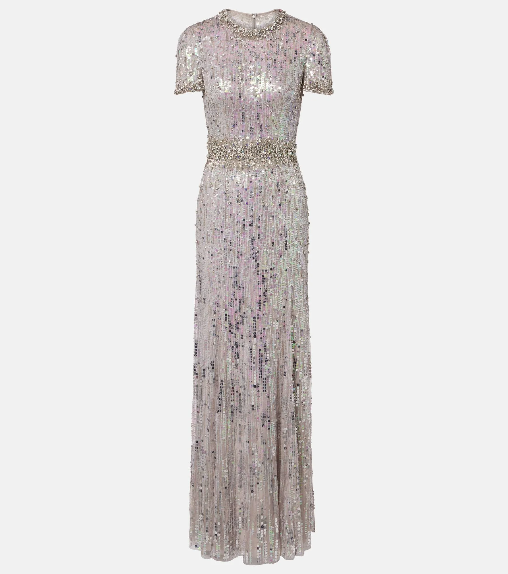 Enriched with romance, Jenny Packham’s intricately embellished designs are made to make an entrance. The Celeste gown is adorned allover with hypnotic silver sequins and features a clean and elegant short-sleeved silhouette. Product Details - Material: 100% nylon - Care instructions: dry clean - Made in India - Designer color name: Mist - Item color: gray, silver - Lining: 100% polyester - Closure: concealed zipped back - Item number: P01124423 Size & Fit - True to size - Fitted - Non-stretchy fabric - The model seen in the picture is 178cm-5'10" and wearing a size UK 8