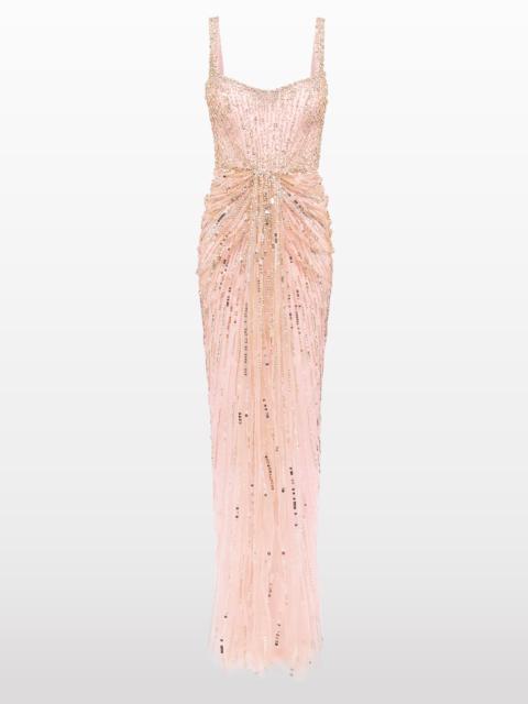 Cut for impact and built for movement, this floor-length gown is fully embellished with sequins that create a liquid-like effect from every angle. The silhouette is clean and structured, featuring short sleeves, a round neckline, and subtle waist definition to balance its all-over sparkle. The skirt falls in a fluid, uninterrupted line, giving the piece a sleek, modern finish. Designed to make a statement.