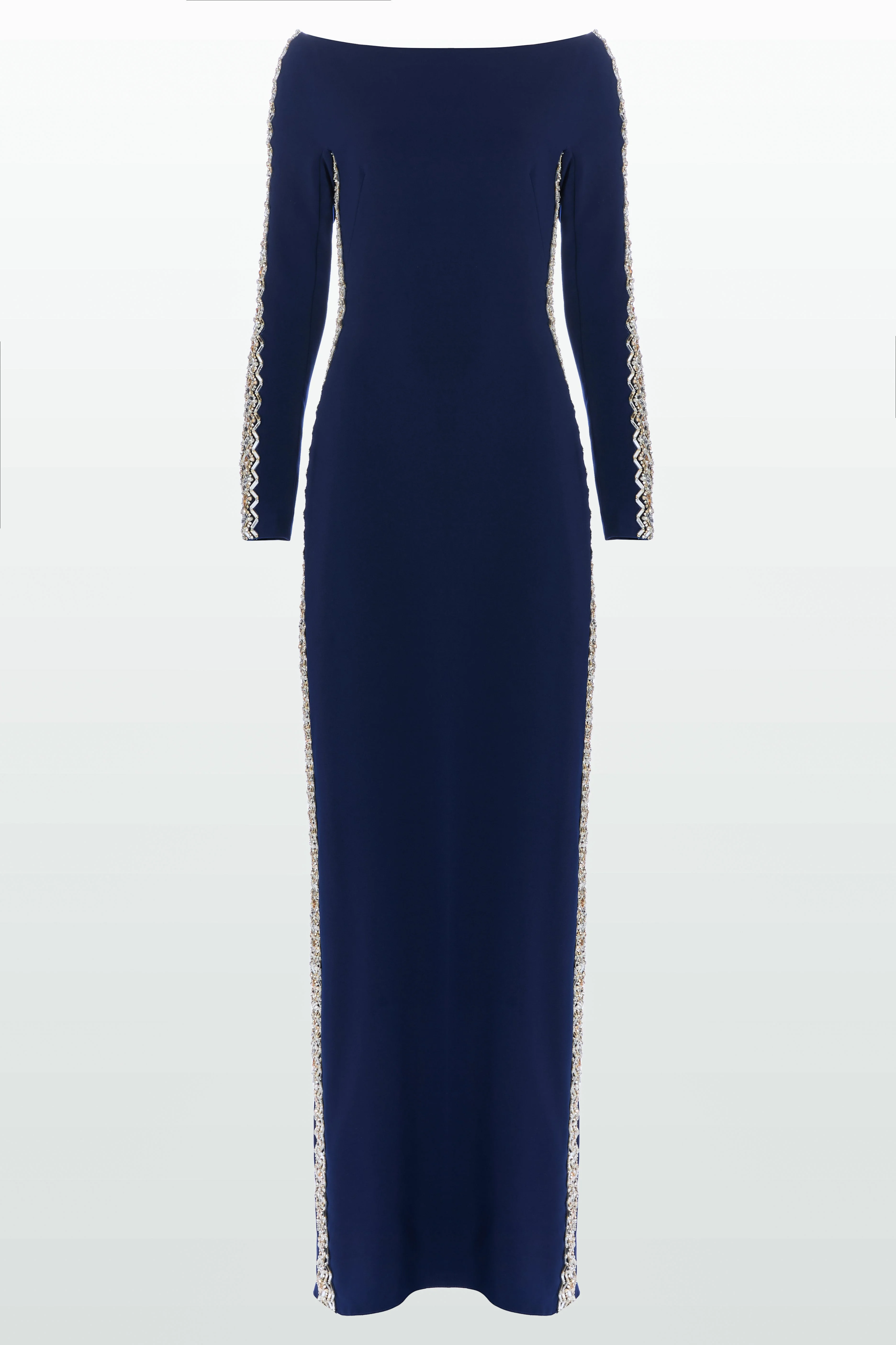 Charisma is the embodiment of sleek sophistication, a floor-length gown crafted for elegance that never fades. The off-the-shoulder neckline enhances the collarbone and upper frame, offering a graceful silhouette with timeless allure. Long sleeves are subtly detailed with fine beadwork, bringing gentle shimmer and adding depth to the sleek composition. The body-skimming fit accentuates the natural curves, while the geometric embellishments along the sides add an architectural, art-deco inspired touch. This gown is ideal for black-tie events, formal winter weddings, high-profile galas, or refined evening functions. With its clean lines, subtle sparkle, and flattering structure, Charisma offers modern femininity with a classic twist — a design that ensures you remain unforgettable from arrival to final toast.