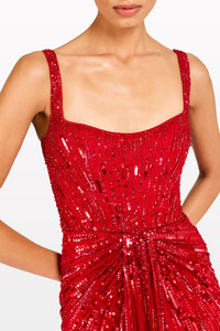 Chrissy captivates from every angle, defined by its razor-sharp neckline and structured straps that frame the collarbones with architectural precision. The silhouette is designed to elongate, gliding over the body with controlled elegance before falling into a fluid hem. Precision-placed sequins cascade vertically from bodice to floor, creating a waterfall effect of light that moves like liquid mercury under shifting angles. A softly gathered waist introduces subtle texture, balancing the linear embellishment with quiet depth. Ideal for gala corridors, red carpet moments or midnight receptions, Chrissy exudes a modern allure rooted in discipline rather than excess. Style with sculptural heels, polished hair and a minimal cuff to enhance its streamlined intent. Each step becomes a gleam, each turn a reflection — commanding, sleek, unforgettable.