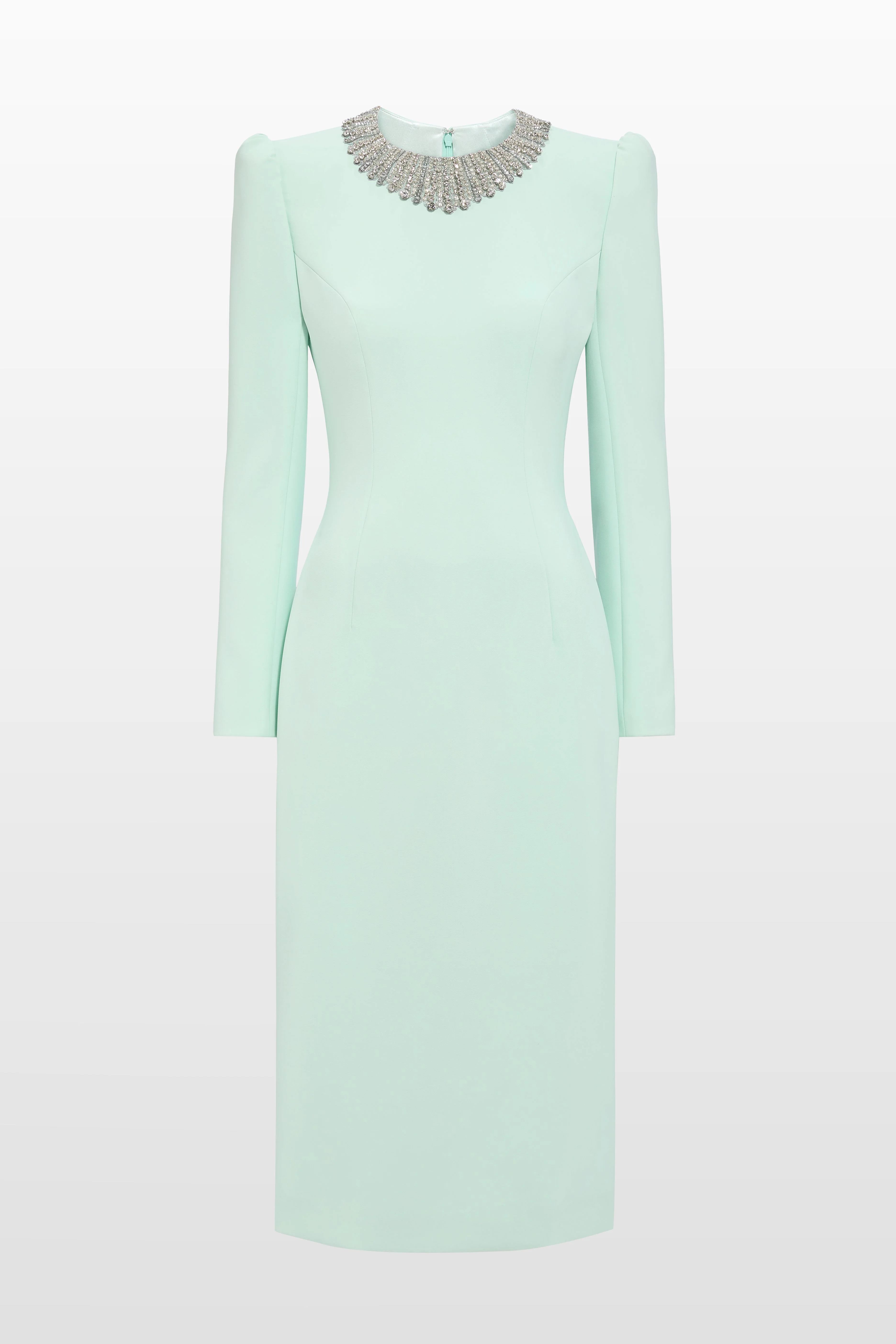 Exude sophistication in this elegant midi dress, designed to make a striking statement. The padded shoulders create a bold, structured silhouette, adding a modern touch to the classic design. The neckline is the focal point, intricately embellished to resemble a statement necklace, with shimmering details that draw the eye and elevate the look. Long sleeves add an air of refinement, balancing the dramatic neckline and giving the dress a polished finish.