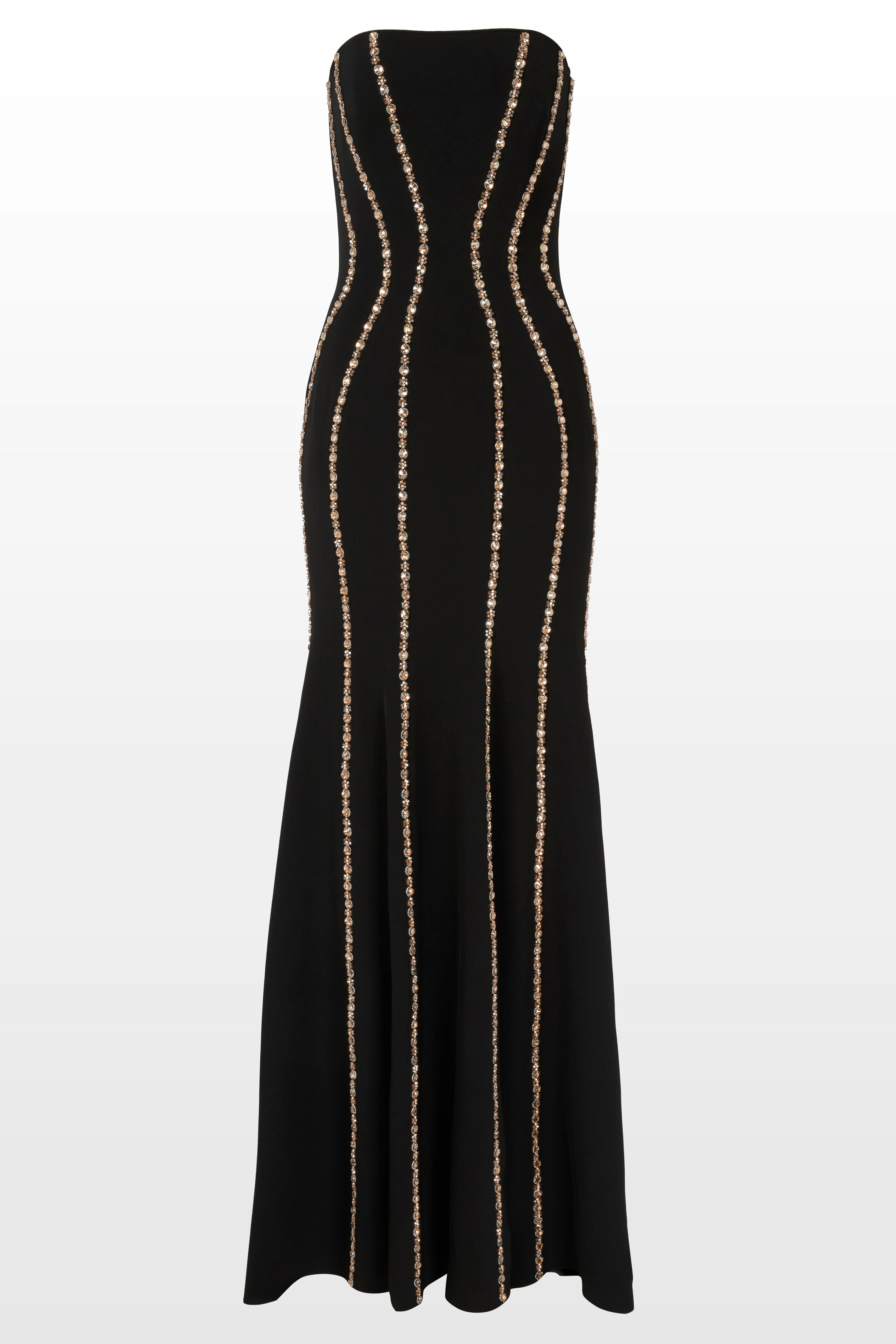 Striking and sophisticated, the Dash strapless black gown delivers timeless eveningwear with a dramatic twist. Crafted for a sleek silhouette, its strapless bodice and vertical beaded detailing create a flattering hourglass illusion that enhances the silhouette. The fine beadwork adds a subtle shimmer that elevates the gown's understated glamour. Flowing into a full-length hemline that gently flares into a refined train, this gown offers movement and presence in every step. Perfect for black-tie events, film premieres, or elegant galas, Dash is a modern evening dress that captures confidence and sophistication. Style it with statement earrings and a sleek clutch for a complete red carpet–ready look.