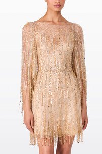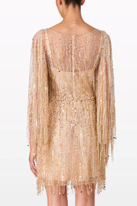 The Dazzle dress captures the essence of playful sophistication with its shimmering aqua and soft green tones. Crafted with precision, the dress features densely packed sequins that create a captivating, radiant effect, ensuring the wearer commands attention from every angle. Playful fringed detailing adds fluidity and movement, allowing the dress to shimmer dynamically as you walk or dance. Flowing sheer sleeves lend an airy, ethereal elegance, contrasting beautifully with the structured, tailored silhouette that flatters the figure and enhances the natural shape. The chic, short length makes this dress ideal for cocktail parties, festive gatherings, celebratory evenings, or lively evening soirees, while its bold colour palette ensures a vibrant and contemporary presence. For styling, Dazzle pairs beautifully with metallic strappy heels, a compact clutch, and delicate jewellery that won’t detract from the dress’s intricate details.