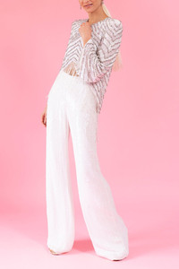 DETAILS AND INSIGHT Jenny Packham disco pant in ivory. 100% Viscose Dry Clean Only Made In the United Kingdom Style DDP102A