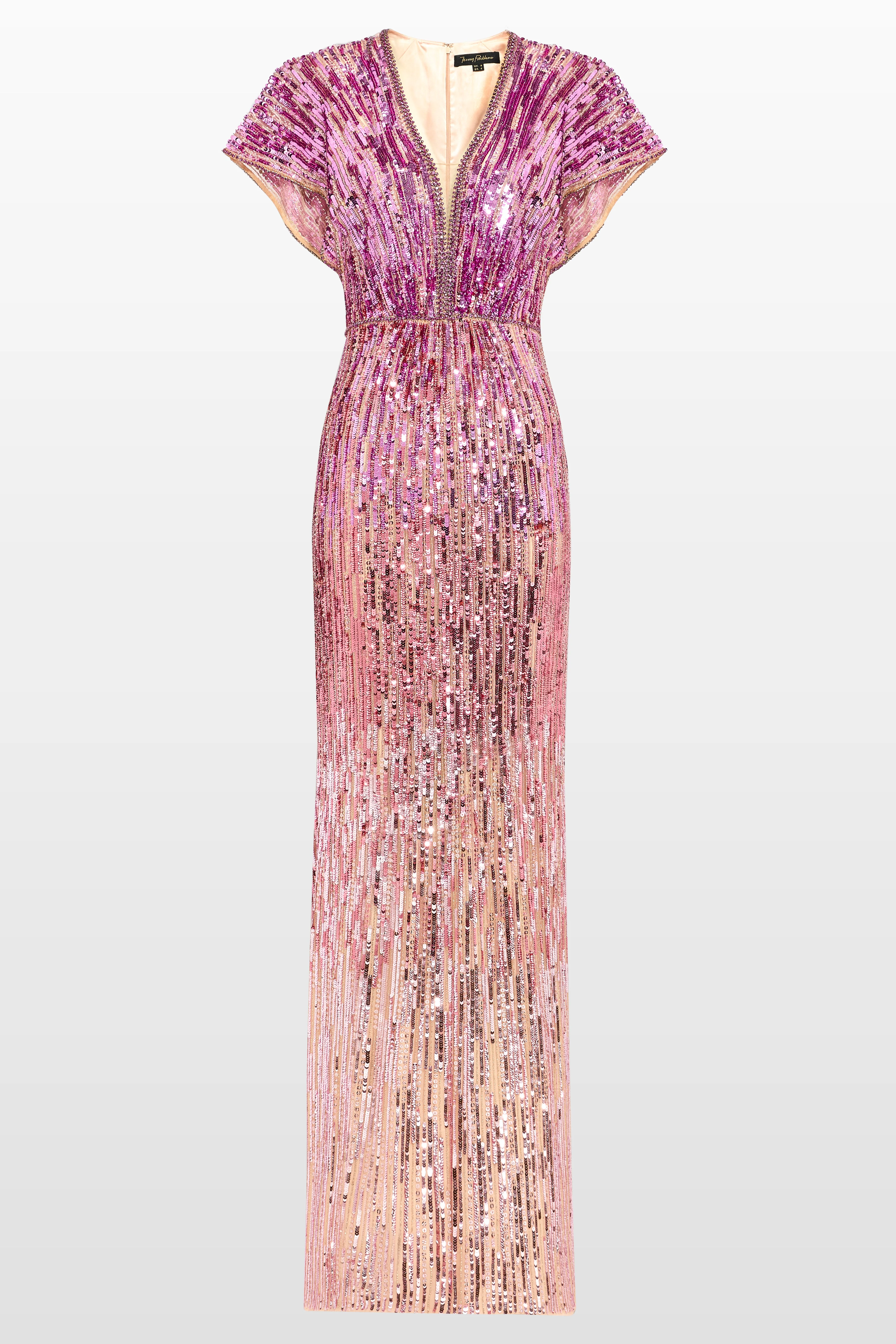 Drenched in sequins, this high-impact sparkle gown is effortless elegance with the deep V neckline and soft cap sleeves framing the decolletage beautifully, while sequins and beads cascade in linear patterns that catch the light with every step. The gently gathered waist enhances the silhouette, flowing into a sleek column skirt designed to move with fluid grace. A radiant choice for occasions that call for modern glamour and timeless sophistication.