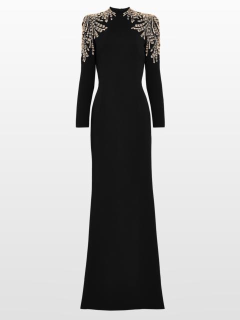 Understated yet undeniably glamorous, this gown is cut in a sleek, statuesque silhouette with softly flared proportions. Its high neckline and short sleeves are framed with tonal sequin and bead embellishment, adding a refined contrast of texture and light. Ideal for a formal dinner or a sophisticated evening event, it offers quiet drama with contemporary polish.