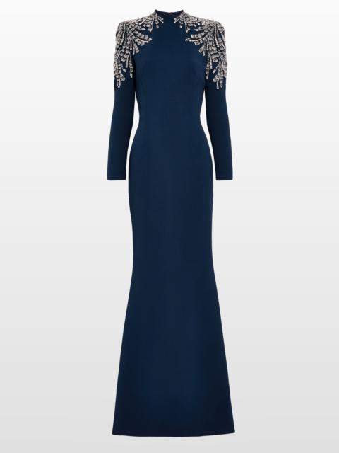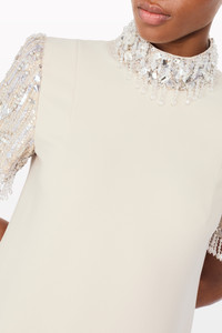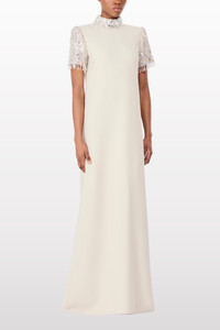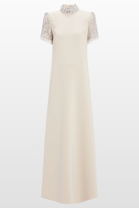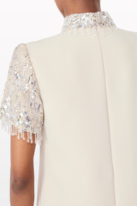 Understated yet undeniably glamorous, this gown is cut in a sleek, statuesque silhouette with softly flared proportions. Its high neckline and short sleeves are framed with tonal sequin and bead embellishment, adding a refined contrast of texture and light. Ideal for a formal dinner or a sophisticated evening event, it offers quiet drama with contemporary polish.