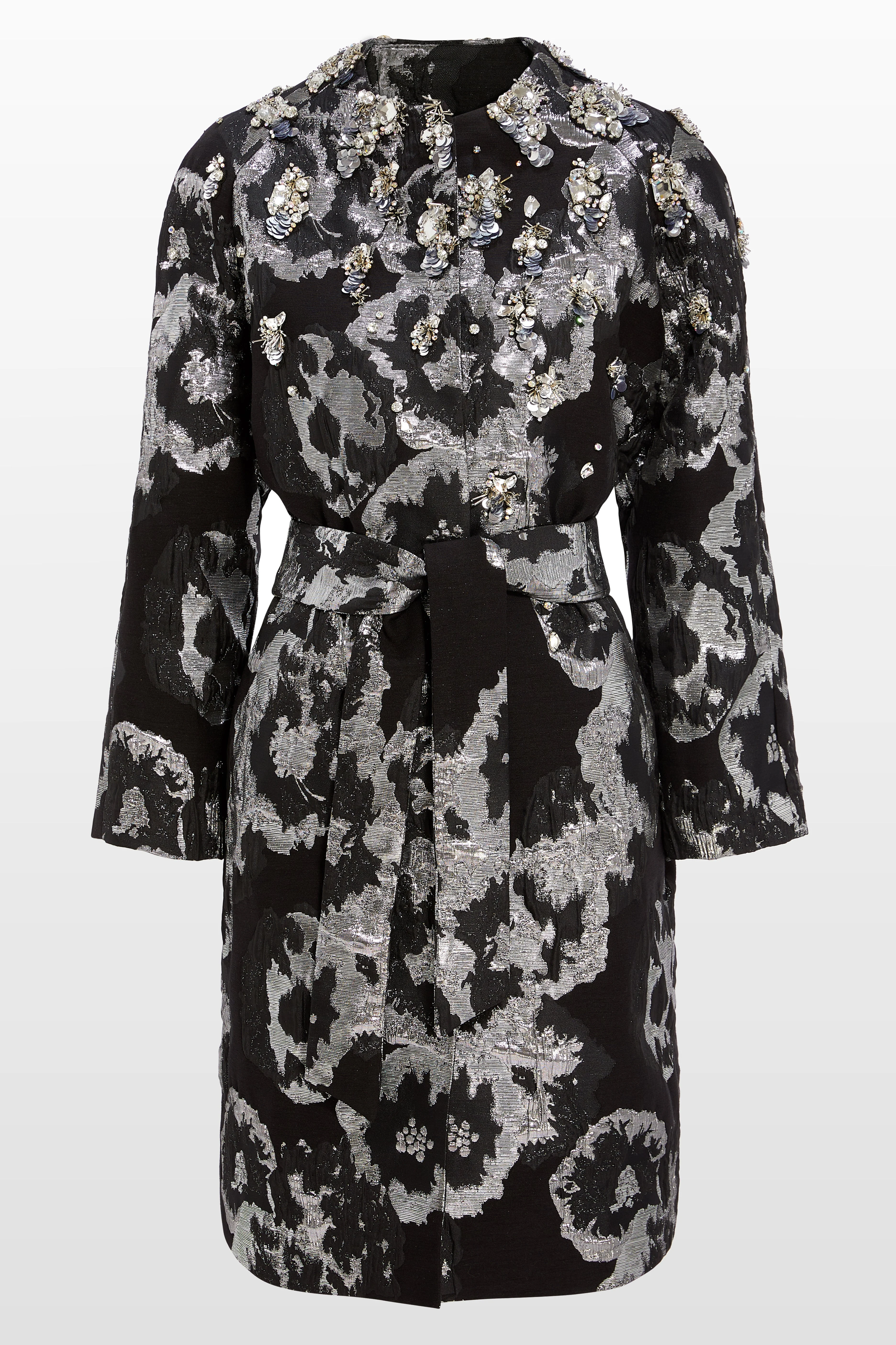 The Darling coat is a bold statement piece, crafted in a structured silhouette and adorned with oversized floral embroidery. A detachable belt cinches the waist for shape, while beaded embellishment across the shoulders adds a sense of opulence. Perfect for formal occasions or adding drama to eveningwear.