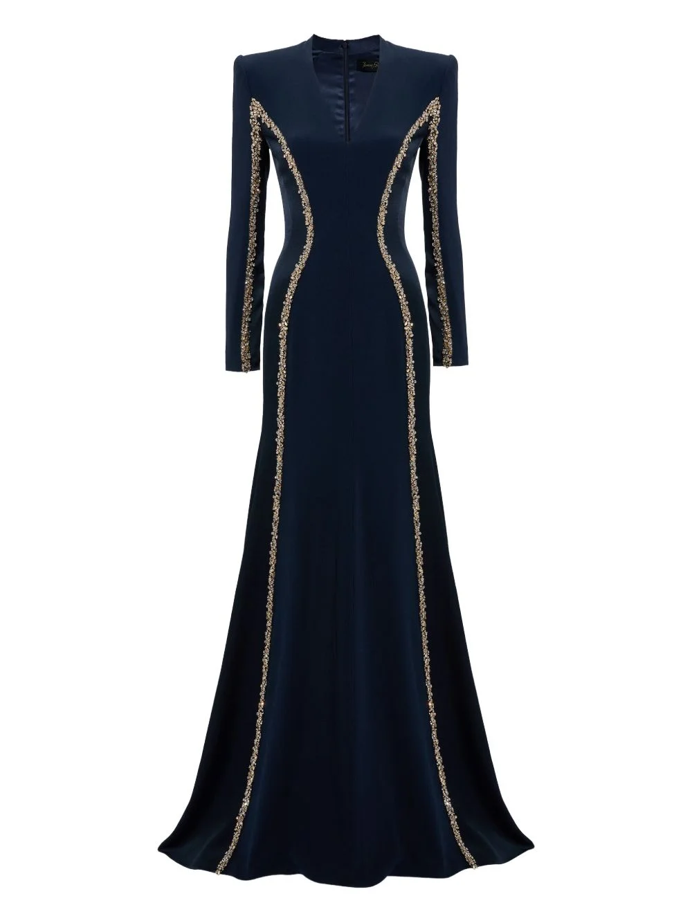 embellished long-sleeve maxi dress Highlights - Blue - Embellishment - V-neck - Long sleeves - Zip fastening - Floor-length Imported Composition Polyester 92%, Polyurethane 8% Washing instructions Dry Clean Only