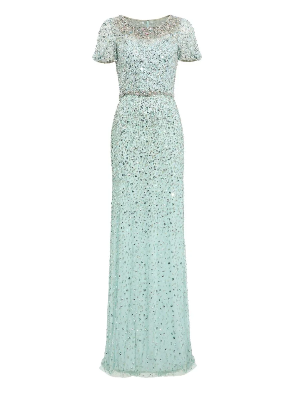 Epoch dress Highlights - Aqua blue - Sequin embellishment - Short sleeves - Round neck - Rear zip fastening - Embellished belt Imported Composition Nylon 100% Washing instructions Read Manufacturer Guidelines