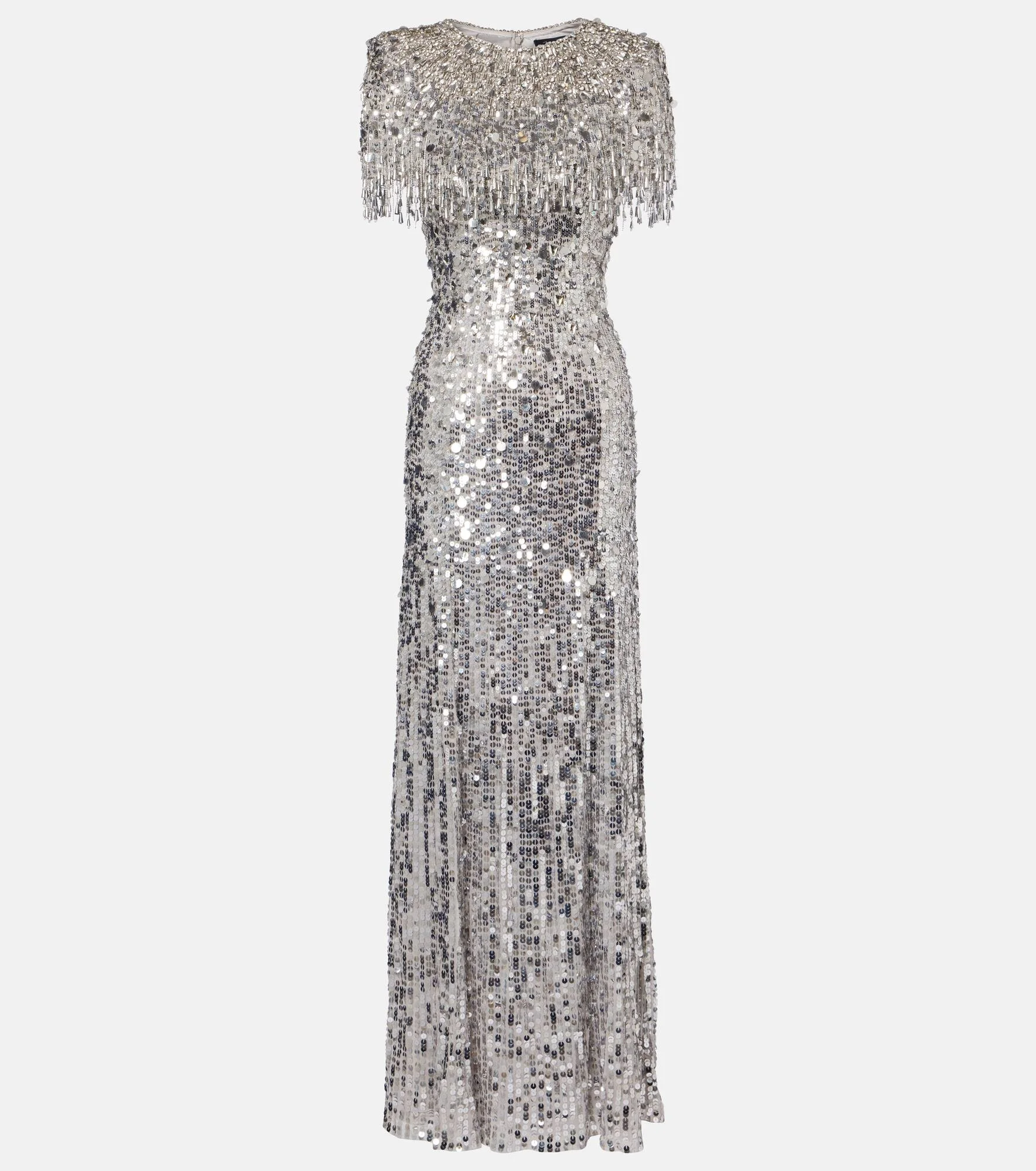 Enriched with romance, Jenny Packham’s intricately embellished designs are made to make an entrance. Adorned with shimmering sequins, the Eugenie gown features fringe details at the bodice and strong shoulders for added impact. Product Details - Material: 100% viscose - Care instructions: dry clean - Made in India - Designer color name: Ammonite - Item color: gray - Lining: 95% polyester, 5% elastane - Shoulder pads - Closure: concealed zipped back - Item number: P01117594 Size & Fit - True to size - Shoulder pad inserts - Fitted - Non-stretchy fabric - The model seen in the picture is 178cm-5'10" and wearing a size UK 8