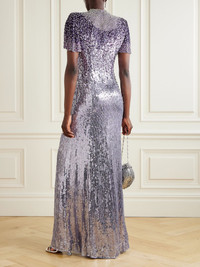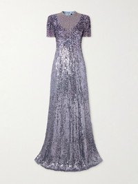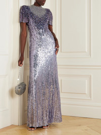 Jenny Packham's scintillating 'Jourdain' gown is a perfect example of the brand's exquisite attention to detail – it's no wonder celebrities and royalty turn to the label for special events. Cut from tulle saturated in scores of sequins and crystals, it has a slim fit with fluttering sleeves and a floaty hem that offer pretty movement. Keep accessories minimal. Size & Fit - Fits true to size, take your normal size - Designed for a slim fit - Mid-weight, heavily embellished, non-stretchy fabric - Model is 177cm/ 5'10" and is wearing a UK 8 Model measurements: - Bust: 80cm/ 31.5" - Waist: 60cm/ 23.5" - Hip: 89cm/ 35" Details & Care - Lilac tulle - Hook and zip fastening along back - 100% viscose; lining: 100% viscose - Fully lined - Dry clean