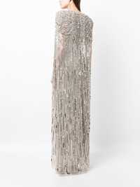 Lotus Lady embellished cape gown Saturated with crystals and sequins, the Lotus Lady gown by Jenny Packham is the ultimate expression of the brand's dedication to intricate detailing. Stemming from the waistline, the sparkling embellishments run in a trail evoking the vibrancy of erupting fireworks. Combined with its retro-inspired cape silhouette that sweeps from shoulder to back, the dress recalls Old Hollywood glamour. Highlights - Silver-tone - Sequin embellishment - Crystal embellishment - Gathered detailing - Cape design - V-neck - Concealed rear zip fastening - Sleeveless - Flared hem - Floor-length Imported Composition Outer: Polyester 100% SIZE & FIT Measurement HIPS 36.22 in(92 cm) LENGTH 59.05 in(150 cm) WAIST 25.98 in(66 cm) BUST 33.07 in(84 cm) Washing instructions Dry Clean Only
