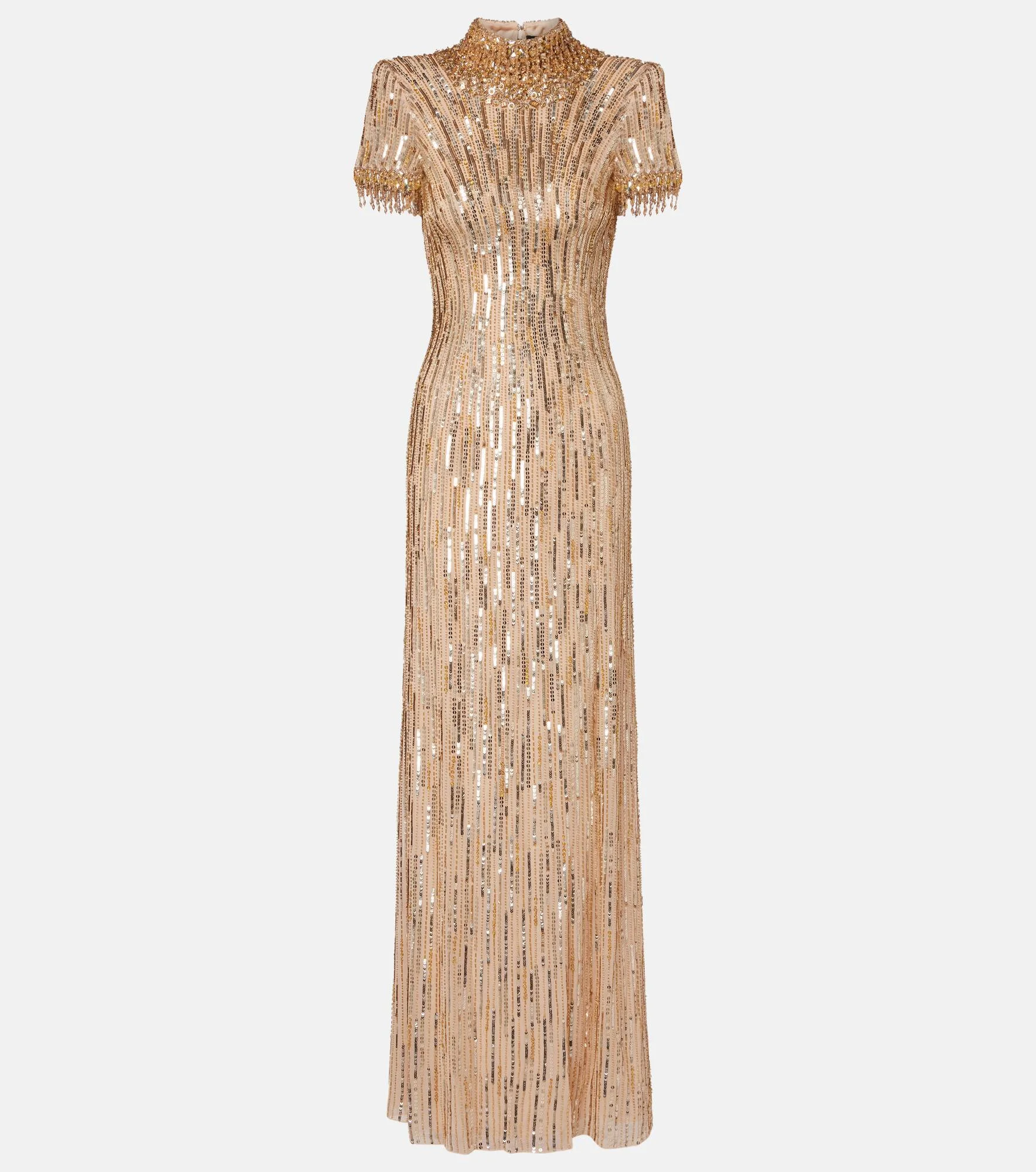 Enriched with romance, Jenny Packham’s intricately embellished designs are made to make an entrance. The Madelaine gown features a short-sleeved silhouette, adorned with exquisite beading along the neckline, bodice, and shoulder fringes for a gleaming touch. Product Details - Material: 100% viscose - Care instructions: do not wash - Made in India - Designer color name: Illusion - Item color: gold - Lining: 100% polyester - Shoulder pads - Closure: concealed zipped back - Item number: P01117600 Size & Fit - True to size - Shoulder pad inserts - Fitted - Non-stretchy fabric - The model seen in the picture is 178cm-5'10" and wearing a size UK 8