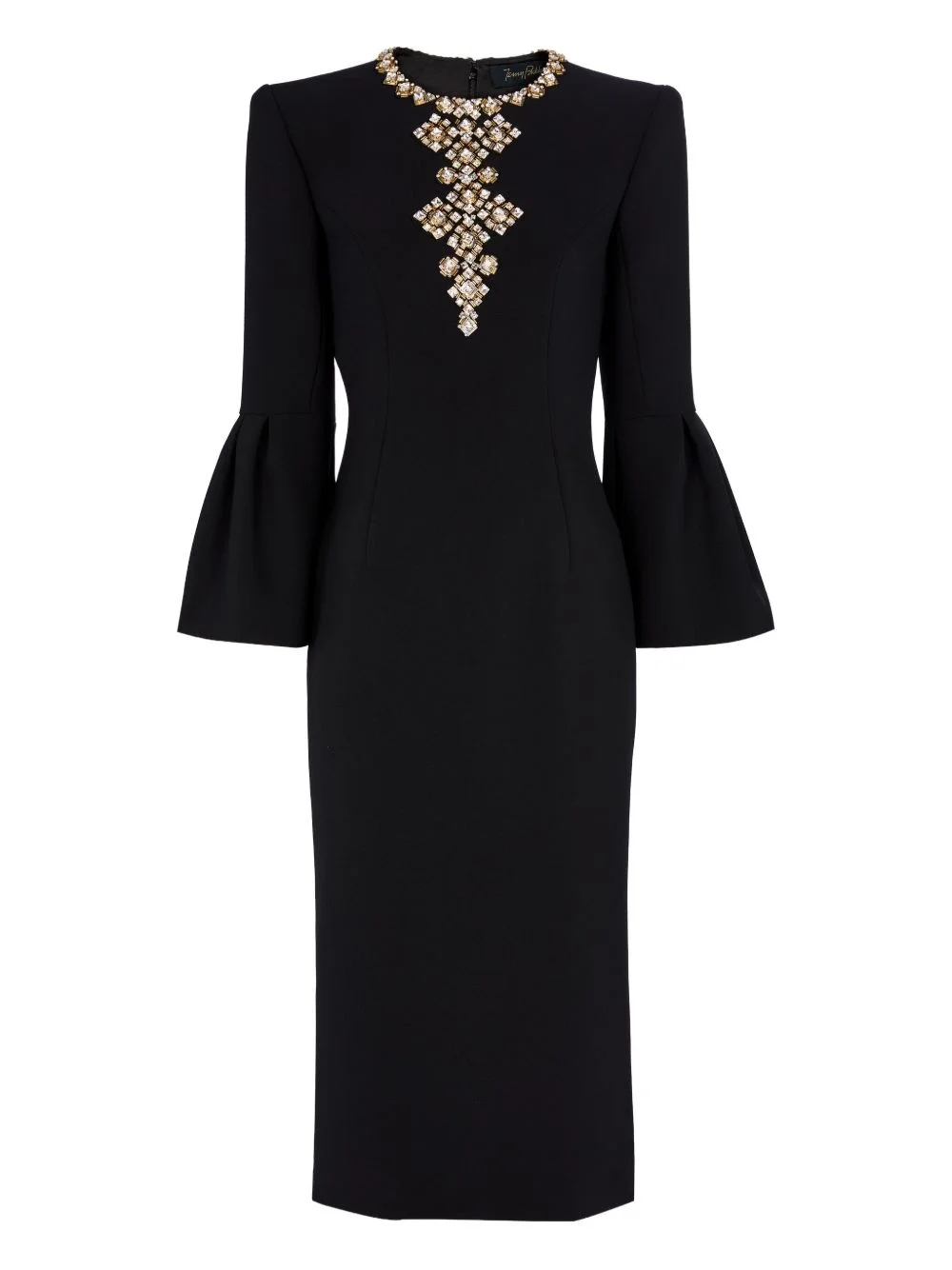 Margot dress Highlights - Black - Concealed rear zip fastening - Crew neck - Long sleeves - Flared cuffs Imported Composition Rhinestone 100%, Polyester 92%, Polyethylene 8% Washing instructions Dry Clean Only