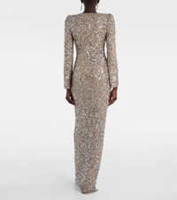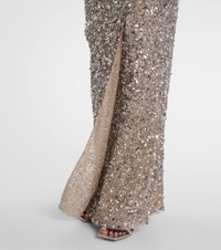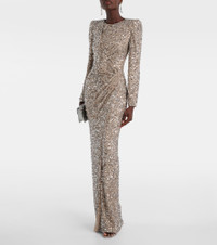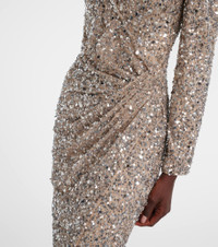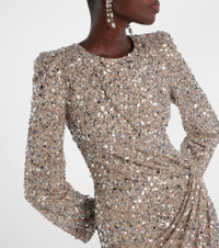 Enriched with romance, Jenny Packham’s intricately embellished designs are made to make an entrance. The Marie gown is adorned with shimmering sequins with gathering on one side and structured shoulders. Product Details - Material: 100% polyester - Care instructions: dry clean - Made in India - Designer color name: Cashmere - Item color: silver, beige - Lining: 100% polyester - Sleeves: long-sleeved - Closure: concealed zipper, zipped back, hook-fastening back - Item number: P01048219 Size & Fit - True to size - Shoulder pad inserts - Cinched waist - Non-stretchy fabric - The model seen in the picture is 178cm-5'10" and wearing a size UK 8