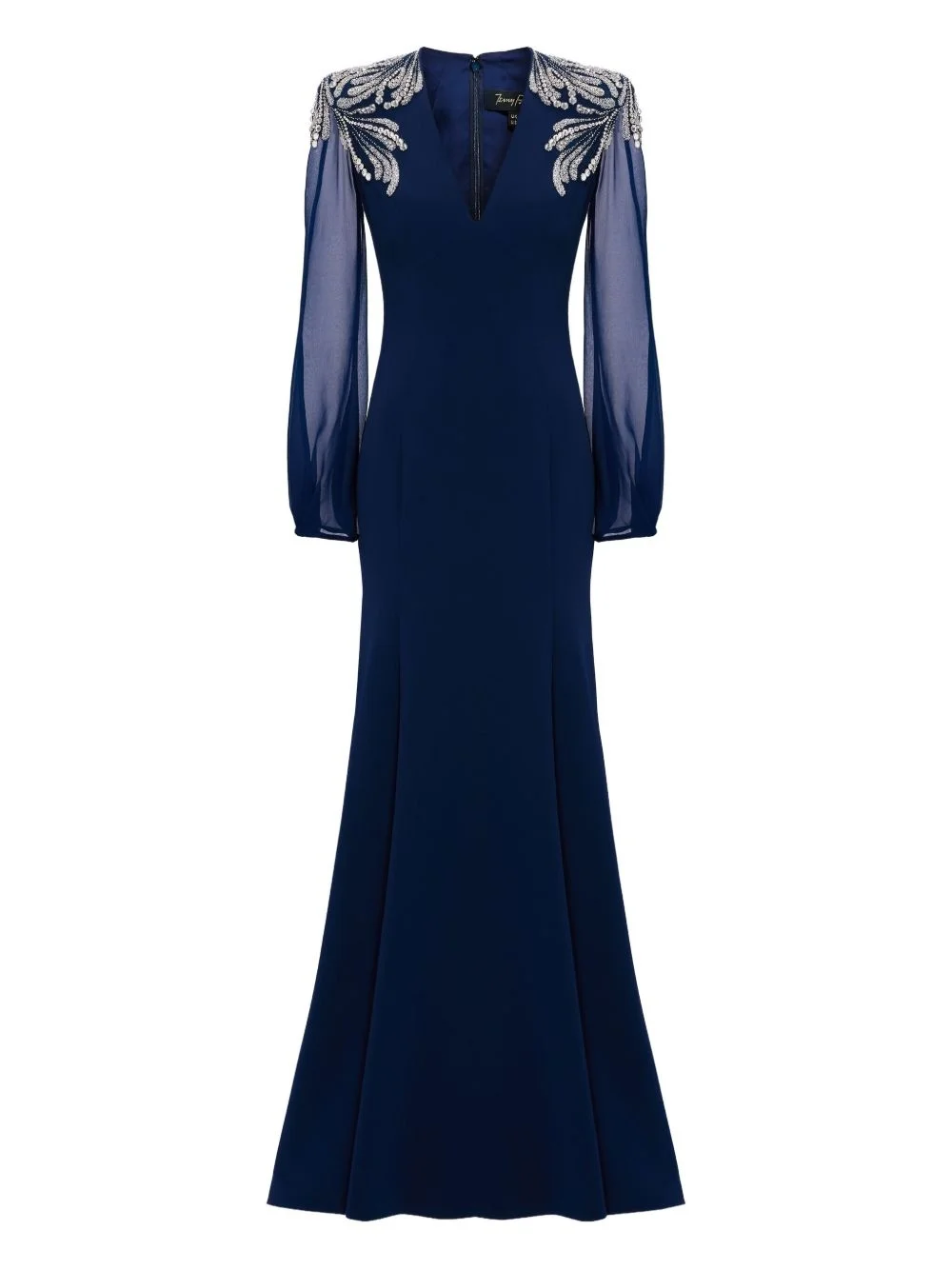 Mercury gown Highlights - Midnight blue - Rear zip fastening - Crystal embellishment - V-neck - Semi-sheer sleeves Imported Composition Polyester 92%, Polyethylene 8%