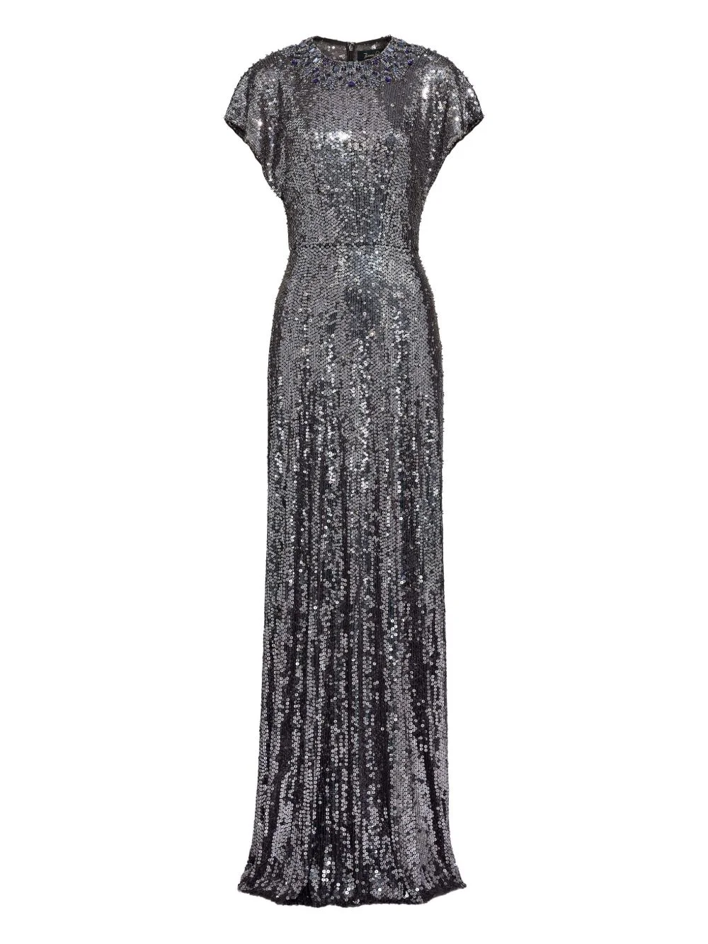 Odisha sequinned gown Highlights - Grey - Sequin embellishment - Short sleeves - Jewel embellishment neck - Flared skirt Imported Composition Nylon 100% Washing instructions Read Manufacturer Guidelines