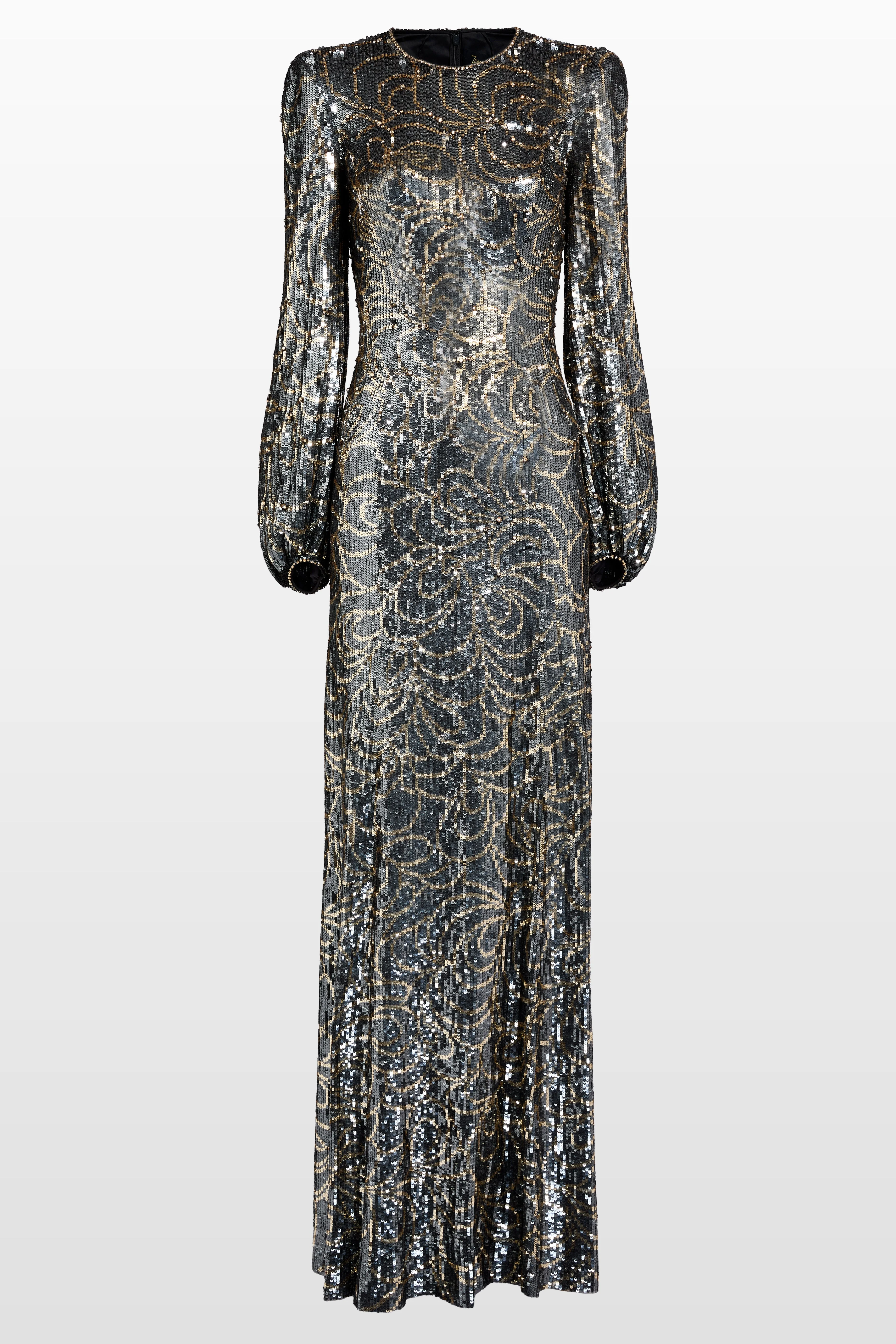 Paradise is a vision of opulent radiance, drenched in shimmering sequins that bathe the gown in liquid light. Its sculpted silhouette skims the figure before gently flaring at the hem, offering a statuesque presence softened by drama. The softly gathered long sleeves evoke a sense of romantic movement, while the high, regal neckline frames the face with quiet majesty. Designed for gala glamour, formal celebrations, or couture-lit evenings, Paradise exudes an almost ceremonial power. Each step ignites a ripple of brilliance, turning motion into spectacle. Style with diamond studs and a sleek bun to let the gown speak in its full splendour, or amplify with metallic heels and a bold cuff for modern edge. A masterpiece of luminosity and line, Paradise is crafted not just to be seen, but to be remembered—a radiant homage to high glamour.