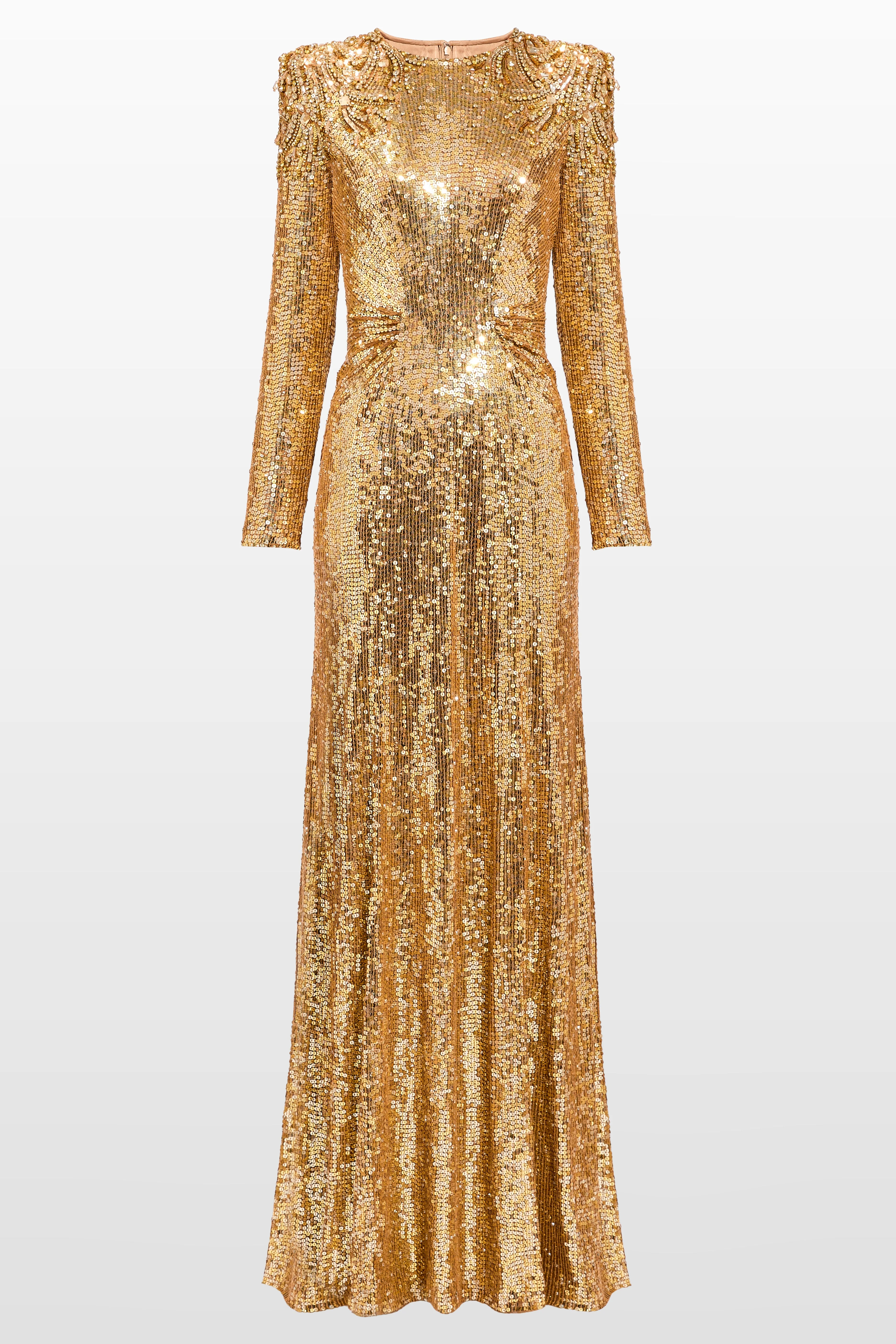 This gown exudes glittery glamour with a sleek, modern silhouette. Designed with long sleeves and a high neckline, it creates a strikingly sophisticated shape, while sequins and beads cover the entire design in a light-catching, liquid-like shimmer. Subtle gathering at the waist enhances the figure, and delicate embellishment at the shoulders adds a final touch of artistry. Crafted for occasions where unforgettable impact is essential.