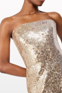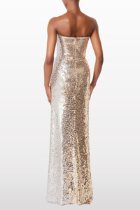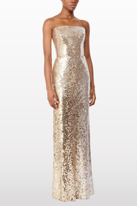 Bathed in high-shine sequins, this strapless column gown delivers a flawless balance of structure and sparkle. The clean neckline and contoured silhouette allow the light-catching embellishment to take centre stage, making it an effortlessly striking option for evening events. Elegant yet impactful, it promises a timeless red-carpet moment.