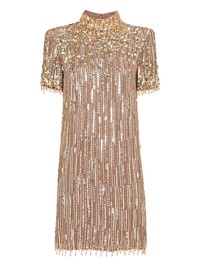 Snapdragon sequin-embellished mini dress Highlights - Taupe - Mock neck - Short sleeves - Back hidden zip-fastening - Sequin embellishment - Beaded-fringe trim - This piece features very delicate detailing. handle with extreme care to avoid damage such as broken feathers or loss of sequins. Imported Composition Viscose Crepe 100%