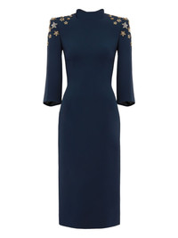 star-embellished mock-neck midi dress Highlights - Dark-blue - Mock neck - Three-quarter sleeves - Star embellishment - Fitted bodice - Straight skirt Imported Composition Polyester 92%, Polyurethane 8% Washing instructions Dry Clean Only