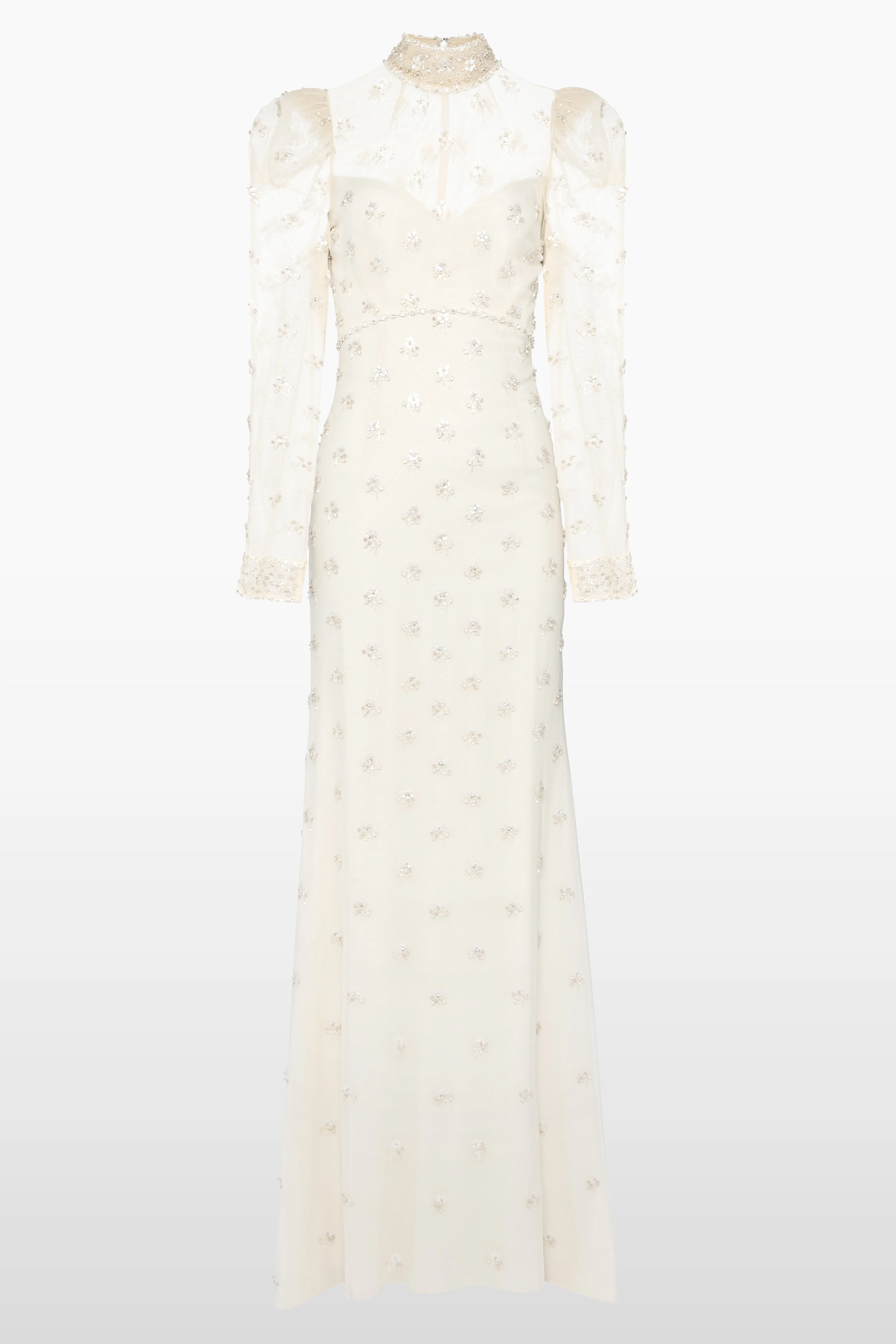 A high, embellished neckline and beaded cuffs frame the design with intricate detail, echoing the hand-worked artistry seen throughout the gown. The structured bodice beneath the sheer overlay offers a flattering fit, balancing contemporary simplicity with vintage allure.