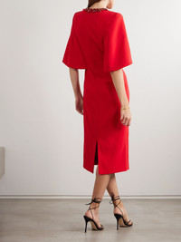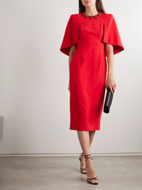 Jenny Packham's 'Ursa' dress is embellished with bursts of sparkling crystals along the neckline. Made from crepe, it has fluttery cape-effect sleeves and skims your figure all the way to the midi hem. Match your lipstick to the fiery 'Chilli Red' shade. Size & Fit - Fits true to size, take your normal size - Designed for a slightly loose fit - Internal shoulder pads - Lightweight, non-stretchy fabric - Model is 180cm/ 5'11" and is wearing a UK 8 Model measurements: - Bust: 85cm/ 33” - Waist: 66cm/ 26” - Hip: 92cm/ 36” Details & Care - Red crepe - Concealed hook and zip fastening at back - 92% polyester, 8% polyurethane; lining: 100% polyester - Fully lined - Dry clean - Designer color: Chilli Red