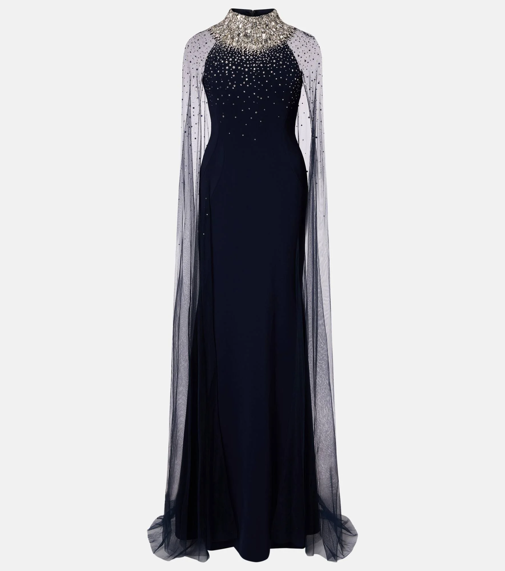 Enriched with romance, Jenny Packham’s intricately embellished designs are made to make an entrance. The Zadie gown captivates with its halterneck silhouette, graceful tulle cape detail, and shimmering crystal embellishments. Product Details - Material: 92% polyester, 8% polyurethane - Care instructions: dry clean - Made in China - Designer color name: Ink - Item color: blue, silver - Lining: 100% polyester - Material II: 100% nylon - Closure: concealed zipped back - Item number: P01117618 Size & Fit - True to size - Fitted - Loose outer layer - Non-stretchy fabric - The model seen in the picture is 178cm-5'10" and wearing a size UK 8