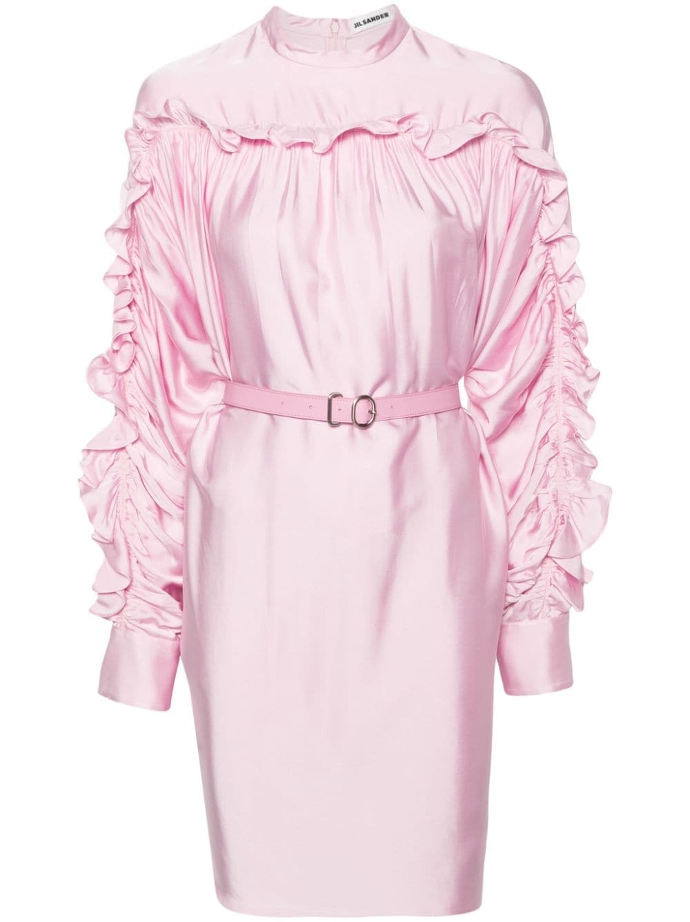 129 satin midi dress Highlights - Light pink - Satin finish - Ruffled detailing - Pleat detailing - Ruched detailing - Mock neck - Concealed rear hook and zip fastening - Drop shoulder - Long sleeves - Buttoned cuffs - Detachable belt - Straight hem - Mid-length - Unlined Made in Italy Composition Viscose 100%, Calf Leather 100%