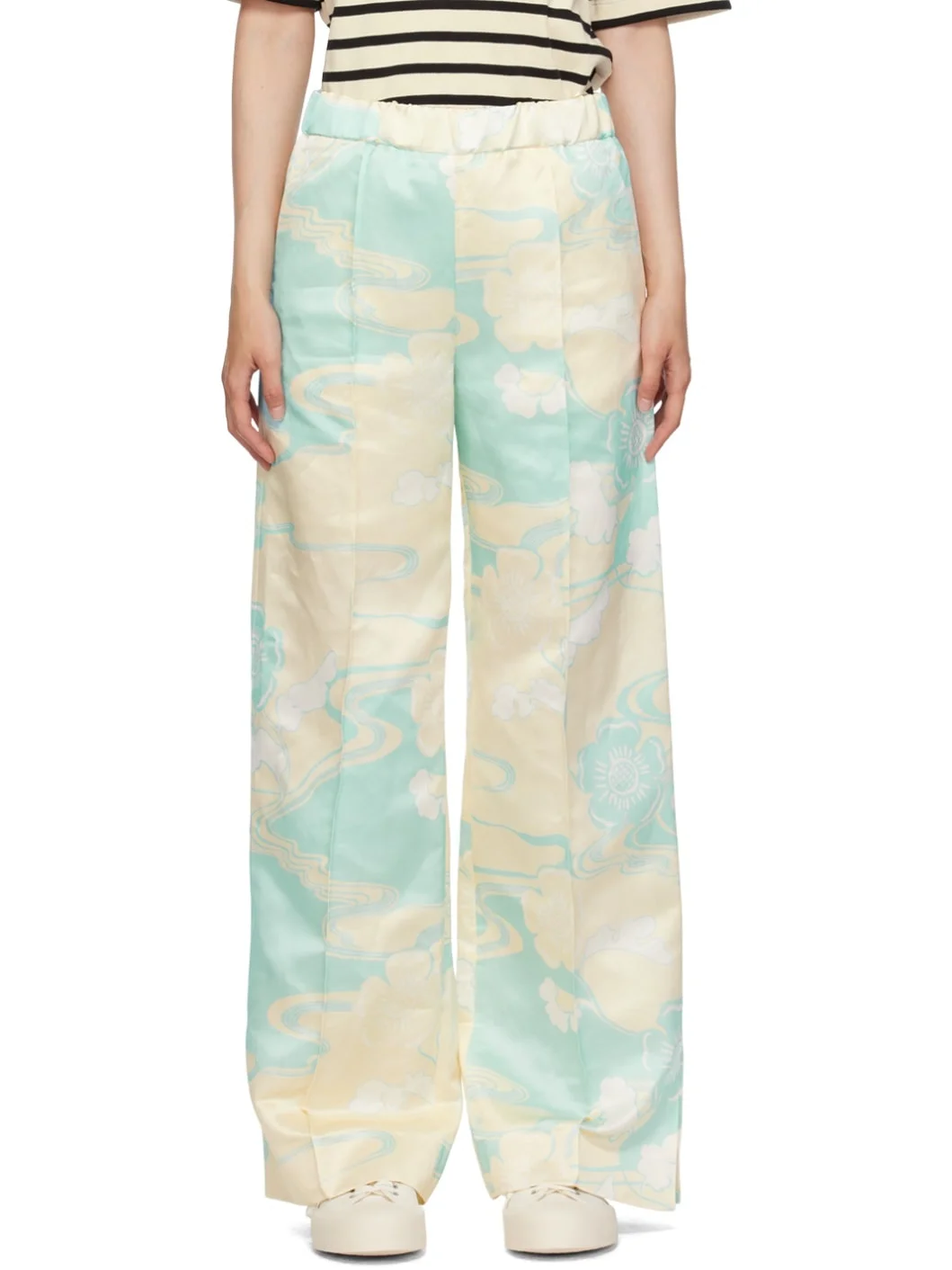 Slub viscose- and linen-blend satin trousers. Graphic pattern throughout. · Elasticized waistband · Three-pocket styling · Pinched seams at front and back · Vented cuffs Supplier color: Blue hydrangea