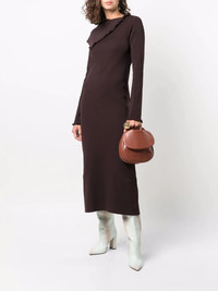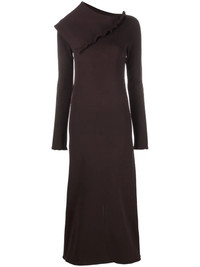 asymmetric collar maxi dress dark brown asymmetric collar ruffled detailing round neck long sleeves straight hem Made in Italy Composition Polyamide 100% SIZE & FIT Model measurements Height 5 ft 9 in(1.76 m) Bust/Chest 33.07 in(84 cm) Hips 34.64 in(88 cm) Waist 25.59 in(65 cm) FittingInformation This piece fits true to size. We recommend you get your regular size Designed for a close fit at the bust, waist and hips Made with a mid-weight fabric Washing instructions Dry Clean Only