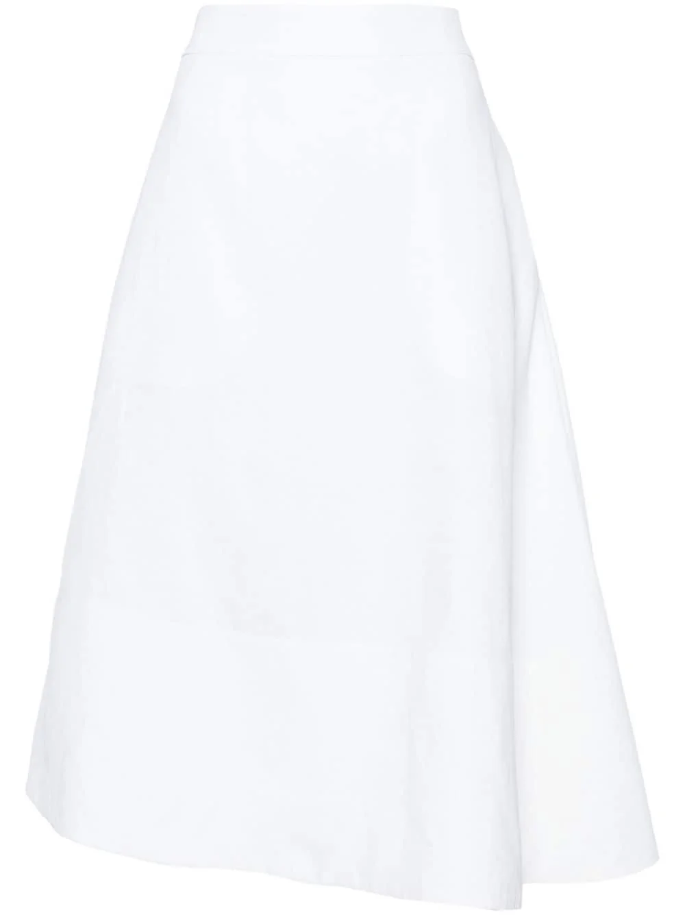 asymmetric linen midi skirt Highlights - White - Linen - Slub texture - High waist - Concealed side hook and zip fastening - Two side slit pockets - A-line skirt - Flared - Mid-length - Asymmetric hem - Unlined Made in Italy Composition Linen/Flax 100% SIZE & FIT Model measurements Height 5 ft 10 in(1.77 m) Bust/Chest 32.28 in(82 cm) Hips 35.03 in(89 cm) Waist 25.19 in(64 cm) FittingInformation Designed with an asymmetric hem, this skirt is intended to be worn just below the waist Made from a midweight non-stretch fabric This piece fits true to size – take your usual size
