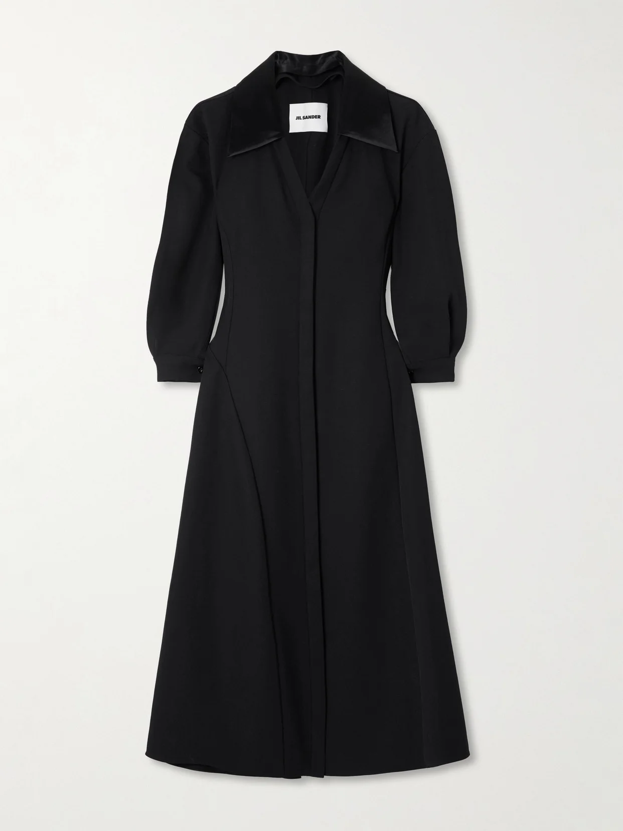 It's the thoughtful details that make Jil Sander's shirt dress feel just a tad cooler than classic styles. Made from wool-twill, it has a lustrous satin collar and streamlined covered placket. It's strategically paneled on the hips to flatter your curves while accentuating the asymmetric hem.