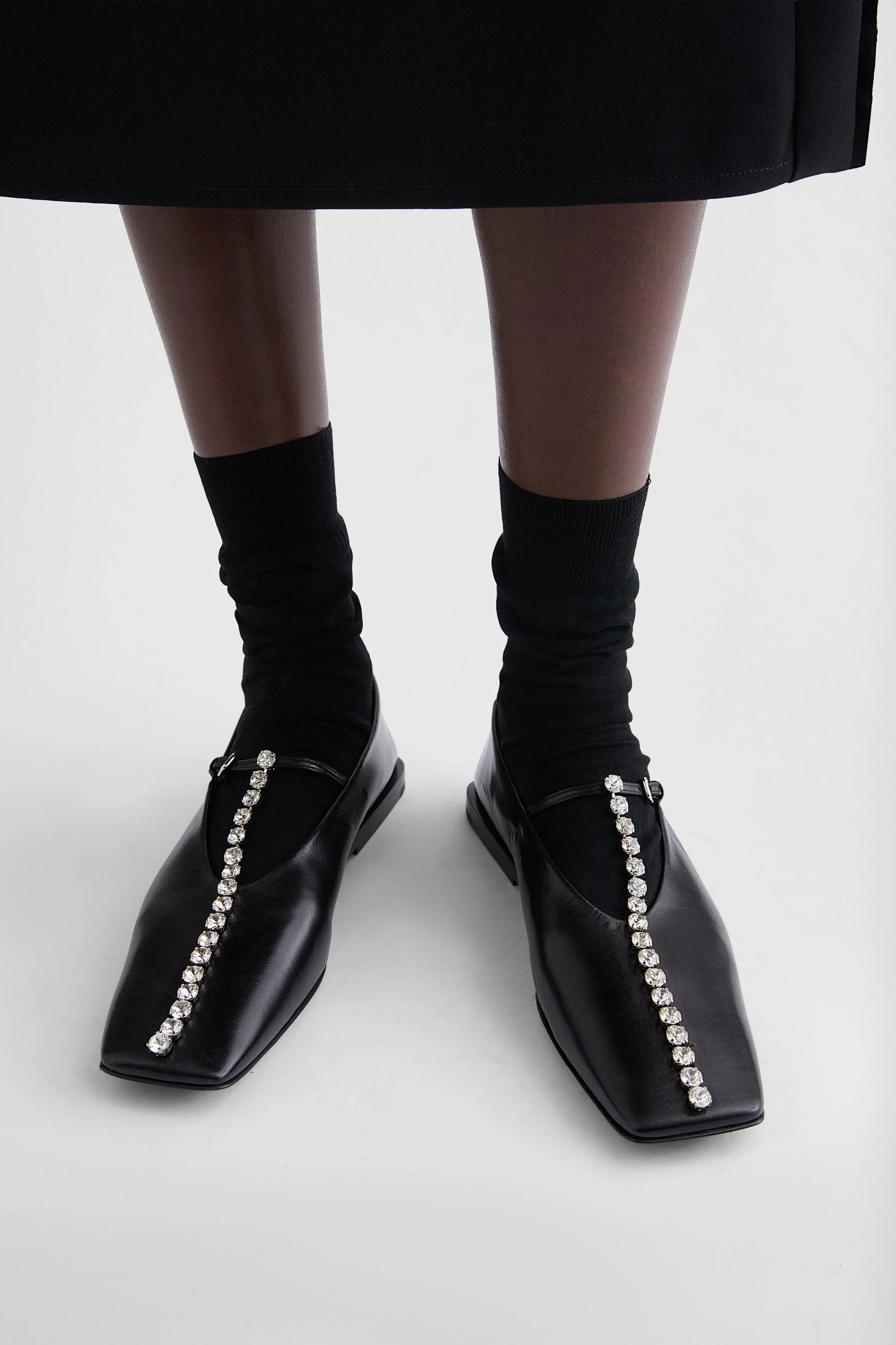 Flat leather ballerinas with row of crystals Details - squared toe - leather strap with buckle - nappa leather insole and lining - calf leather sole - Jil Sander logo branded insole - 100% goat leather - made in Italy - StyleID: J15WZ0034P7588001