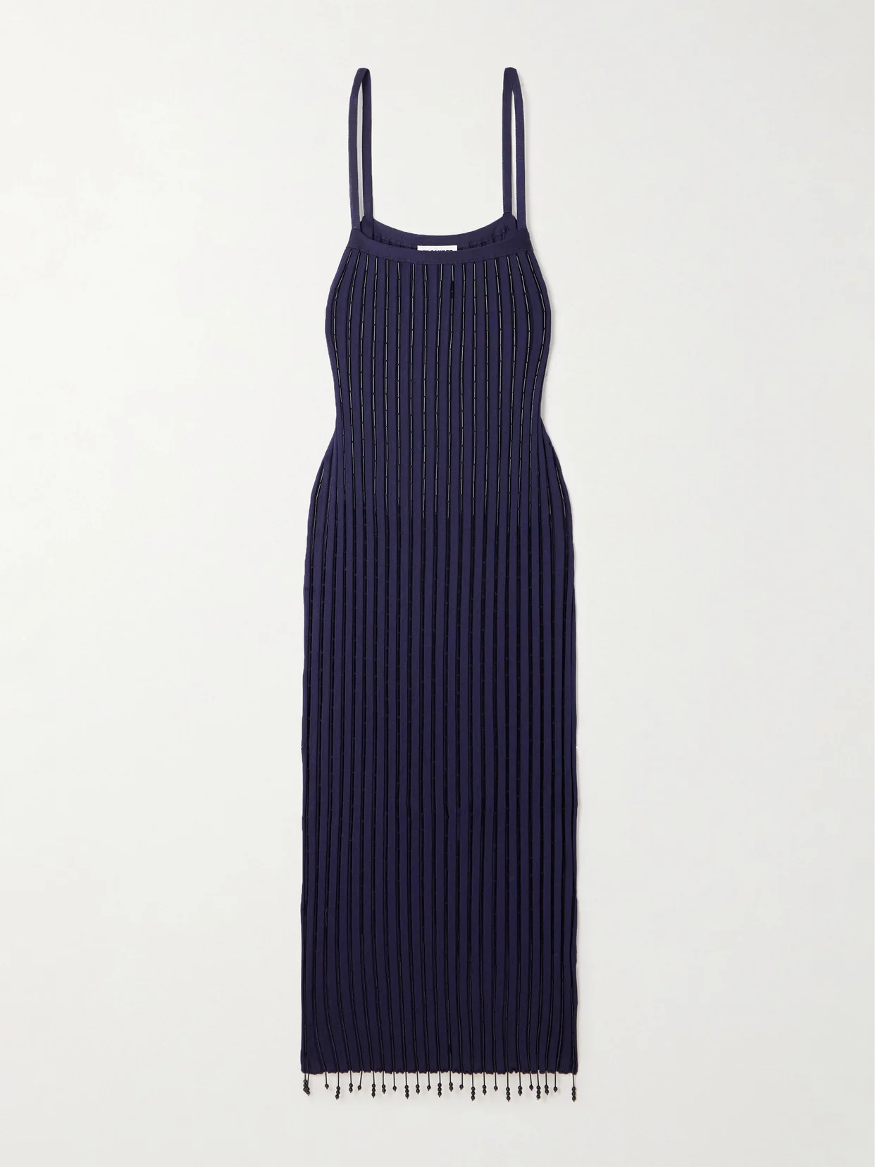 Jil Sander's maxi dress is decorated with vertical rows of beads that catch the light and are arranged in clusters that dangle at the hem. It's made from ribbed-knit to accentuate the slightly loose fit and has slim straps. Style yours with contemporary accessories.