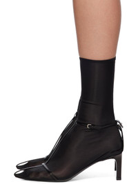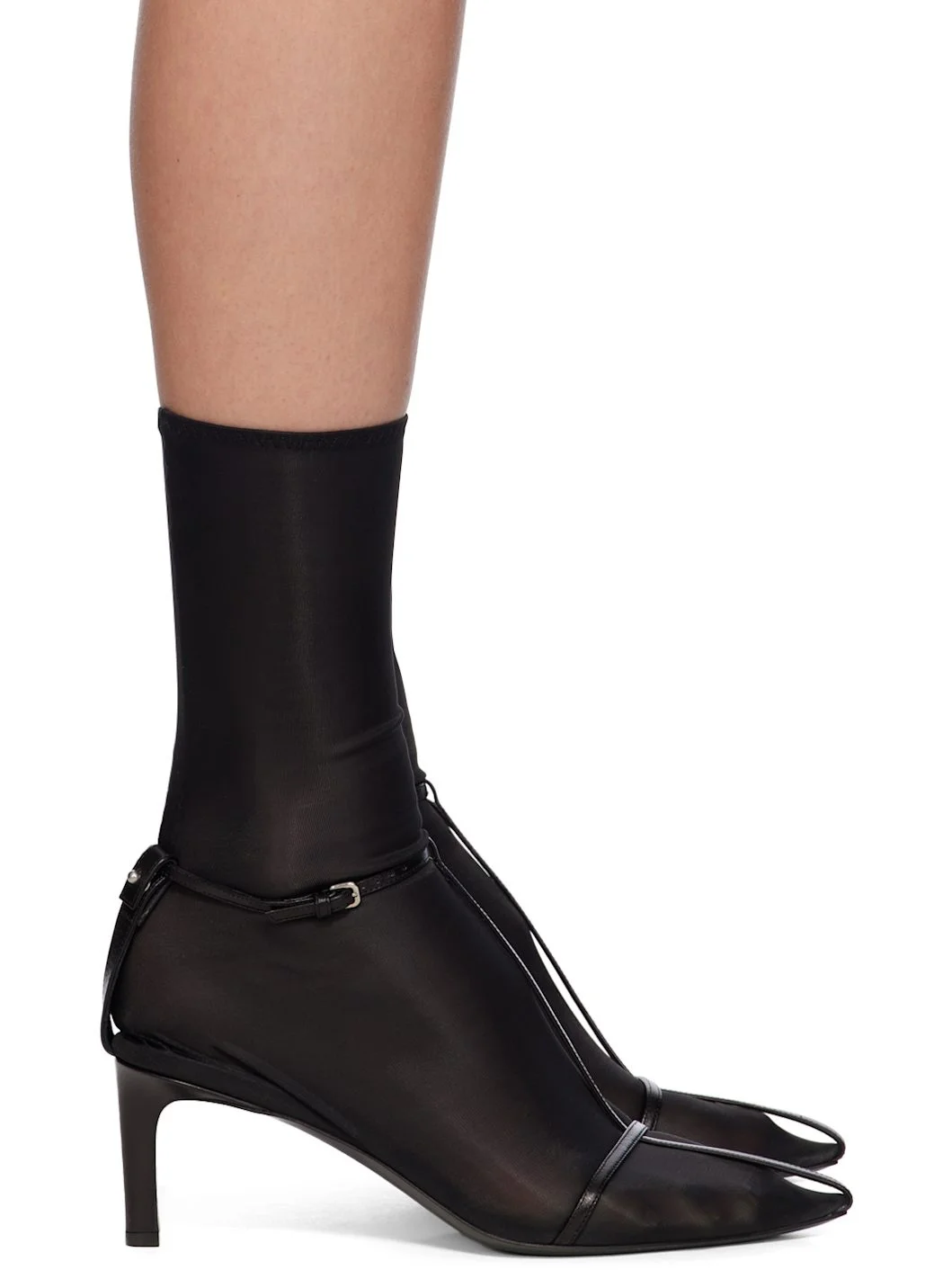 Mid-calf buffed leather and semi-sheer stretch nylon jersey sock-style boots. · Pointed toe · Pin-buckle ankle strap · Padded leather footbed · Covered kitten heel with rubber injection · Leather sole Supplier color: Black